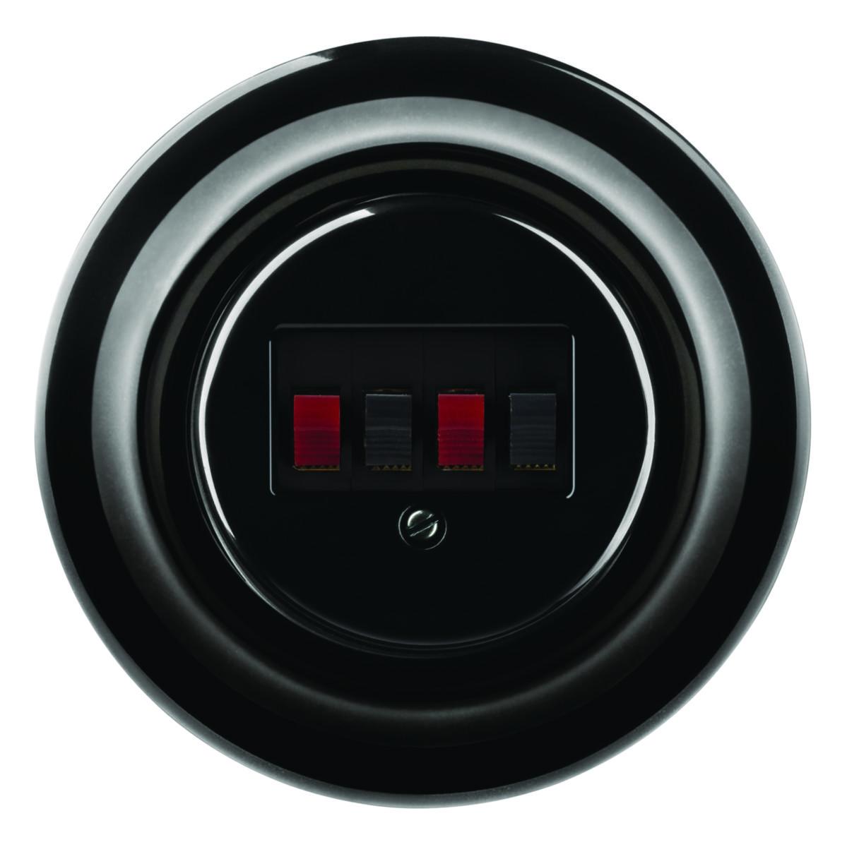 Strömställarsortiment i svart porslin med retro design. Insatserna är moderna med skruvlösa anslutningar.