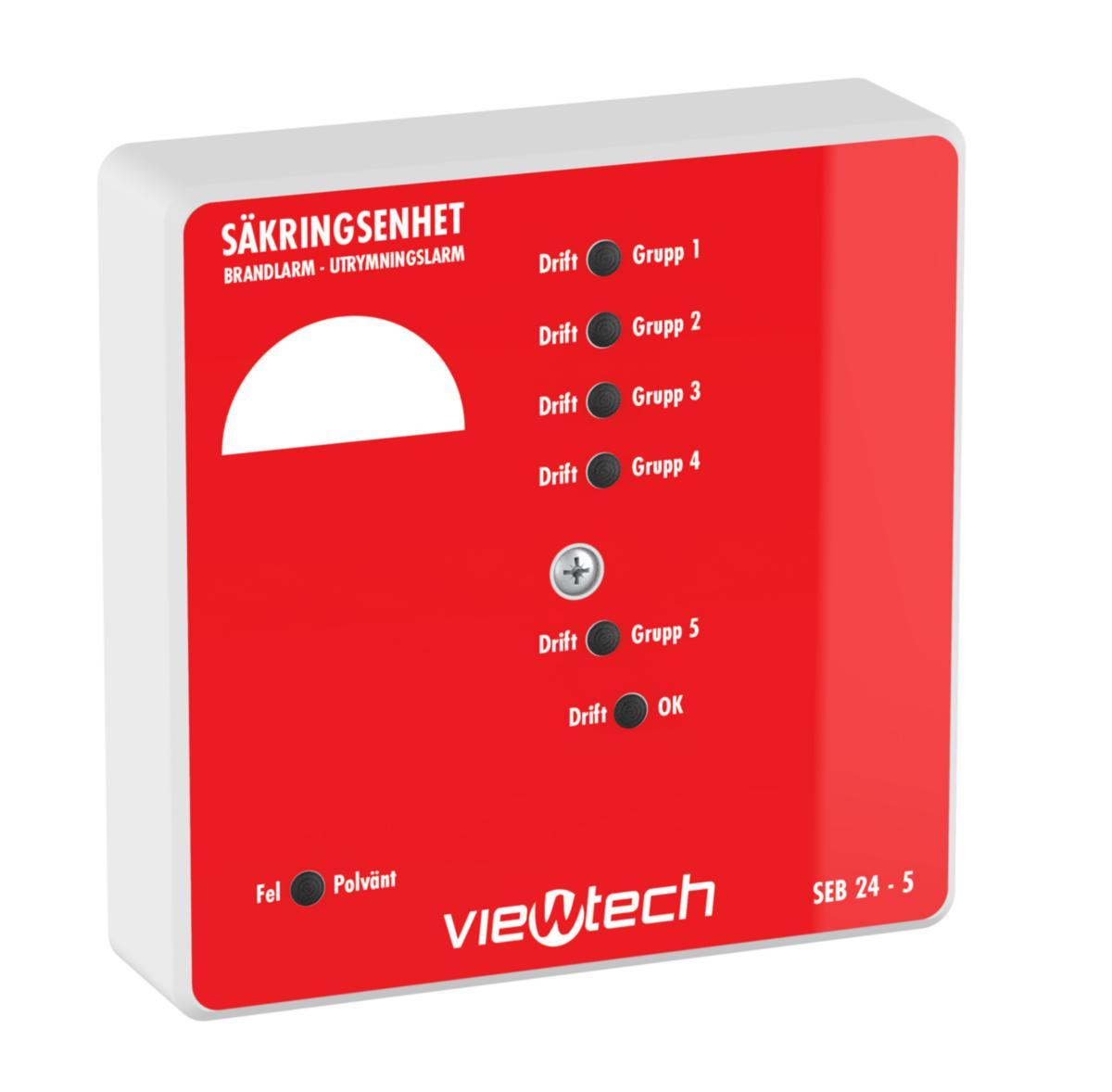 Sakringsenhet SEB-24-5 har fem 2-poliga grupper. Varje grupp avsakras med 2A. Varje grupp indikeras med lysdiod vid drift. Vid fel slacks summadiod for drift och diod for fel tands. Felrela med en fri vaxling finns. Enheten levereras komplett med kapsling.