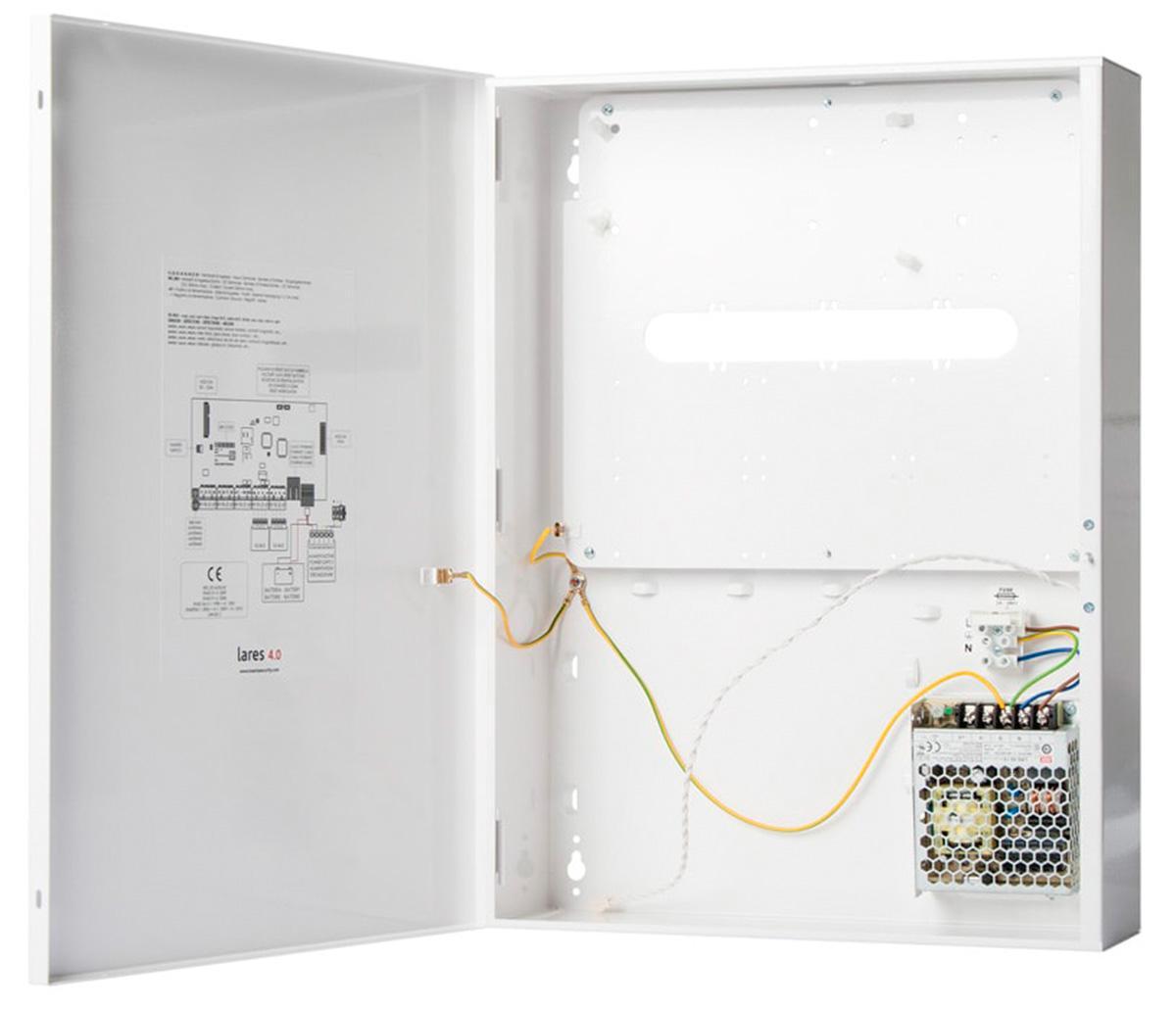 Vit plåtkapsling med strömförsörjning 3,4 A, 50 watt avsedd för lares 4.0. Den rymmer centralapparat lares 4.0, sju expansionskort eller en telemodul och ett backup-batteri 12 VDC, 18Ah.