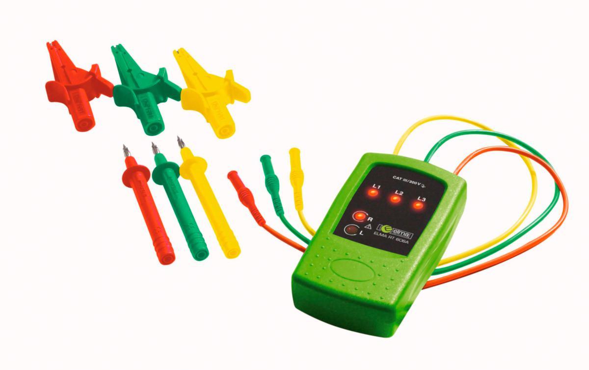 Liten och behändig elektronisk fasföljdsvisare, som med lysdioder indikerar fasföljden samt rotationsriktningen. Instrumentet är tillverkat enligt EN 61010-1 KAT III 300V. Levereras med isolerade krokodilklämmor, isolerade testpinnar och svensk bruksanvisning.