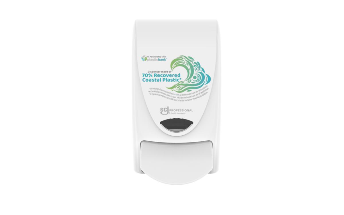 Unik 1 liters sluten dispenser för slutna, förseglade patroner. Dispensern är tillverkad av 70%* återvunnen plast från kustområden**, lämplig för användning på toaletten på alla företag och offentliga institutioner.
