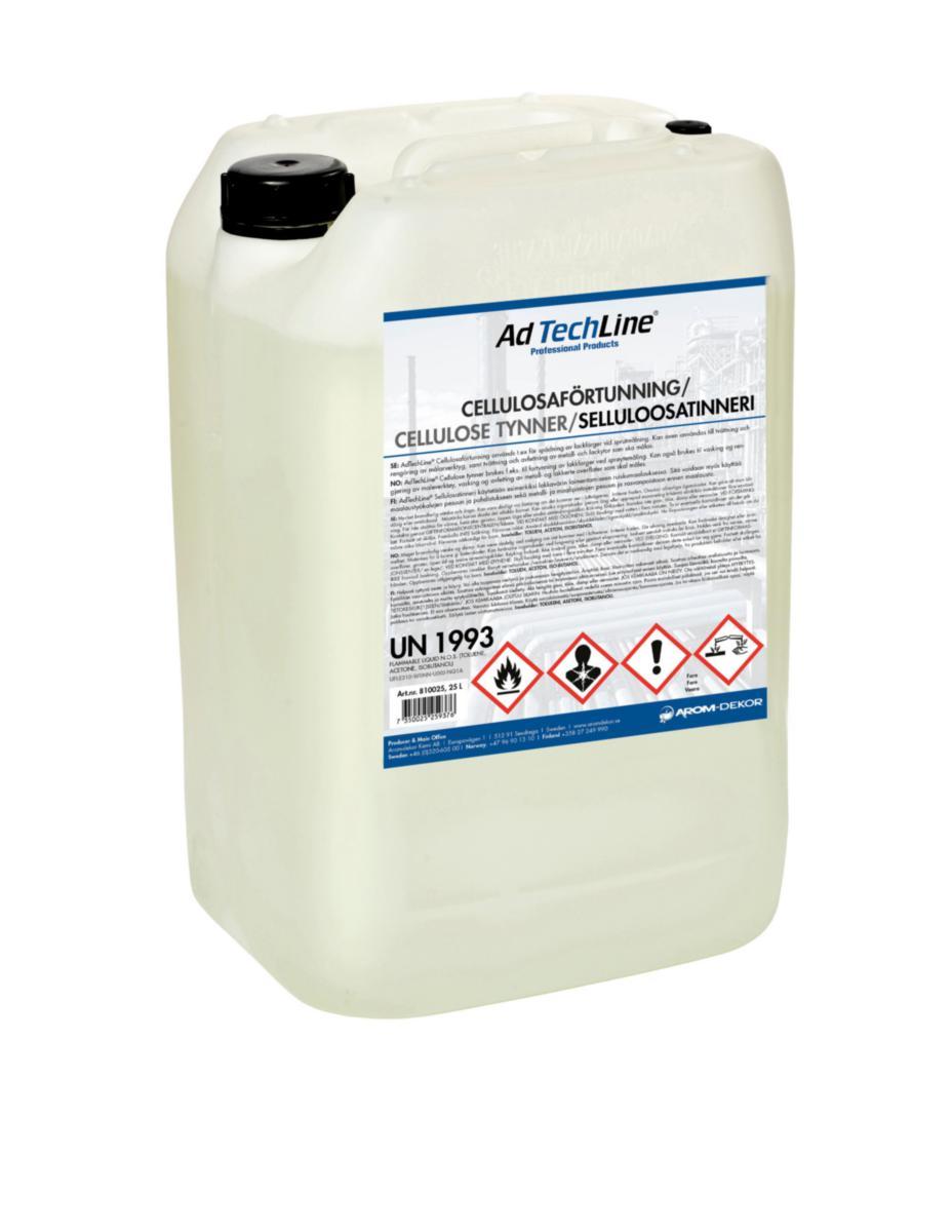 AdTechLine® Cellulosaförtunning, för tvätt av plastytor innan lackering. För rengöring och förtunning av polyester. Löser fläckar från oljeprodukter, lim och klistermärken. För spädning av lackfärger vid sprutmålning. Kan även användas till tvättning och rengöring av målarverktyg, samt tvättning och avfettning av metall- och lackytor som ska målas.