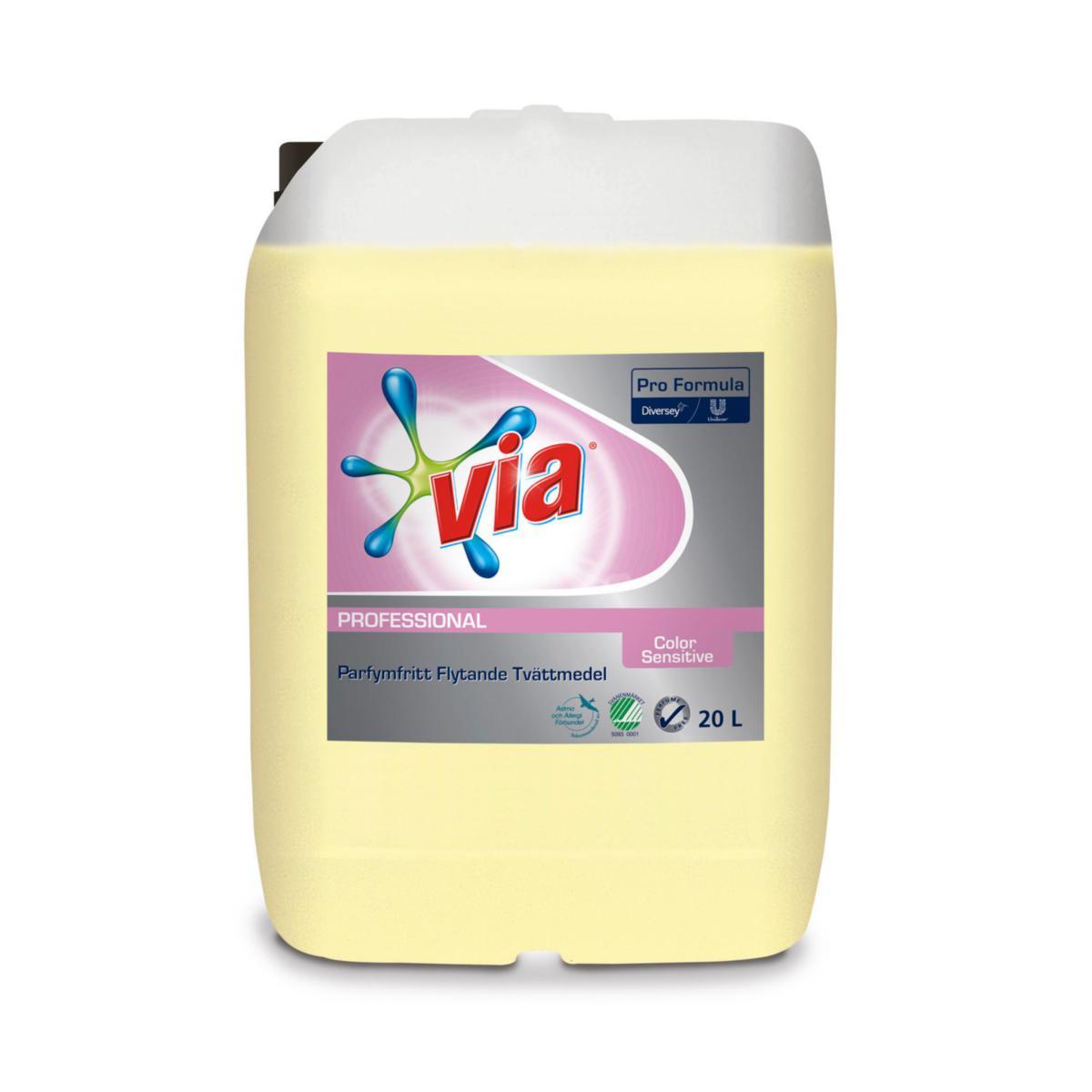 Via Pro Formula Color Sensitive är ett koncentrerat och effektivt tvättmedel utan parfym, färgämnen eller blekmedel som passar både vita och färgade textilier. Det innehåller enzymer som effektivt avlägsnar svåra fläckar. Inte lämplig för tvätt av silke och ull.