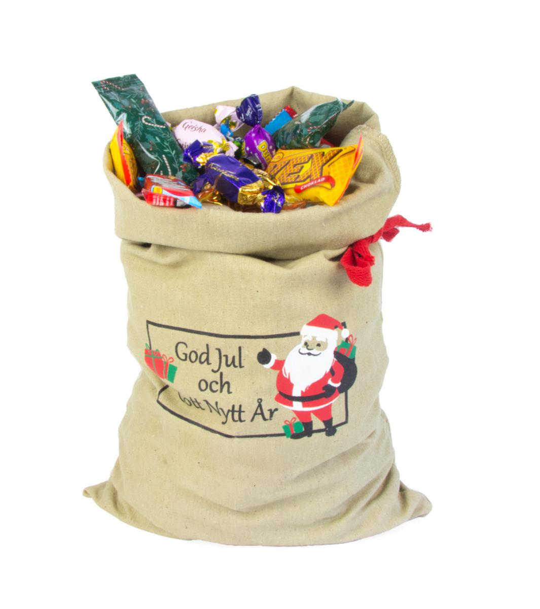 Säck med blandat inslaget varumärkesgodis! Tomte & God jul & Gott Nytt år hälsning är standard - tryck till logga direkt på säcken eller julkort som knyts i snöret för tydlig avsändare!