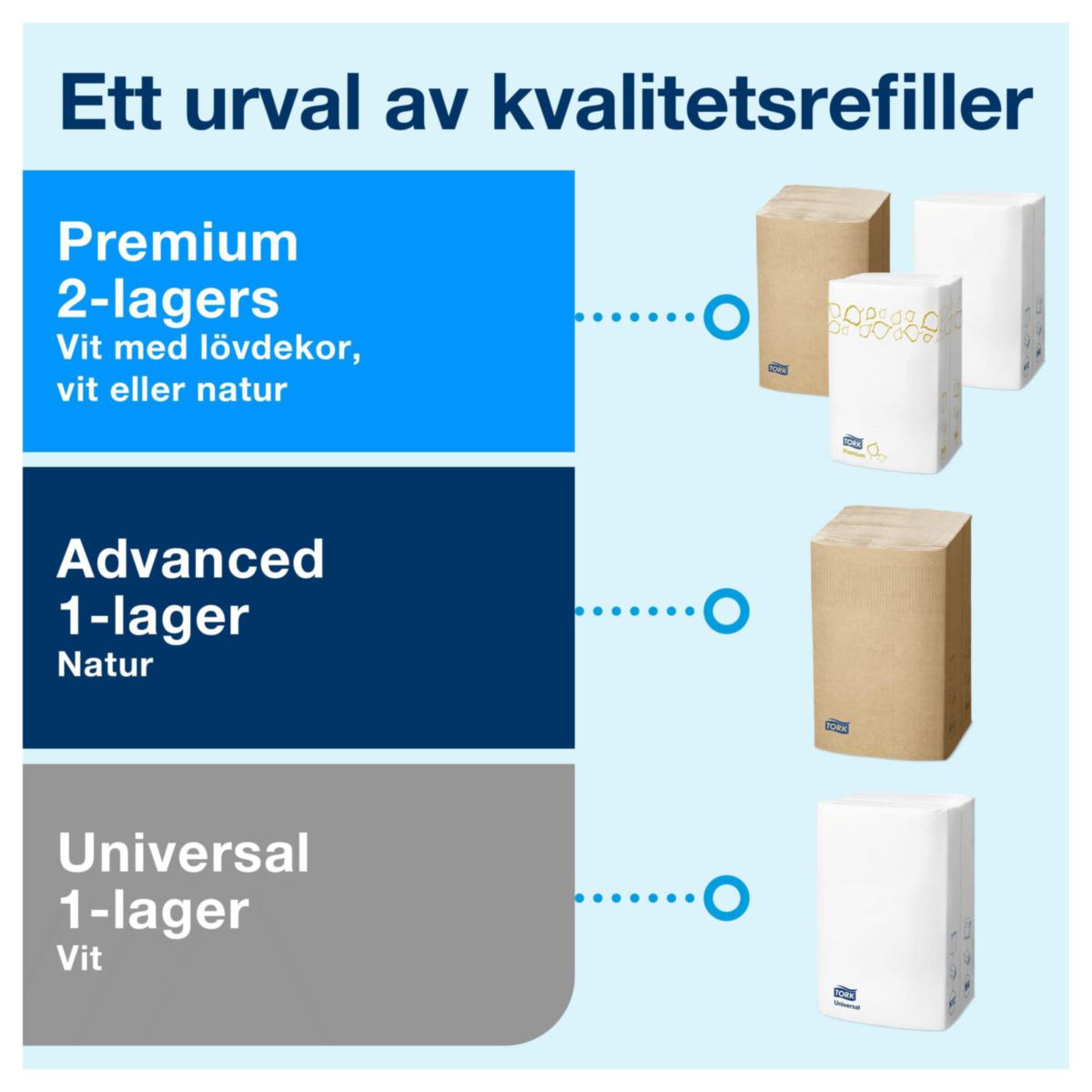 Dispenser Tork servetter N4. Minst 25% minskad förbrukning med kedjevikt systemservett jämfört med traditionella dispenservetter. Avfallet minskar med minskad förbrukning. 400 st/dispenser.