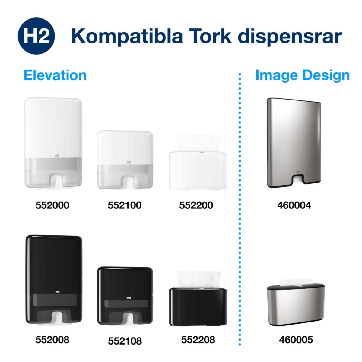 Pappershandduk. Kedjevikta. Högsta kvalité; starka, mjuka och högabsorberande i TAD-kvalité. Användaren blir snabbt torr om händerna vilket ger bättre handhygien. Arken ligger vikta så att nästa ark automatiskt dras fram och ligger klar för användning i Tork Dispenser H2. 2-lag + decor.