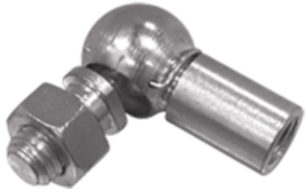 Vinkellänk i förzinkat stål med säkringsbygel. Invändig vänstergänga. Hon och handelen är högergängad.