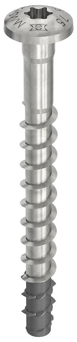 Lämplig för infästning i aggressiva miljöer där höga krav ställs på korrosionsskydd som vid tunnelbyggen. Betongskruvens skalle och stam är av rostfritt stål. Spetsen är av härdat kolstål och skär gängan i betongen.