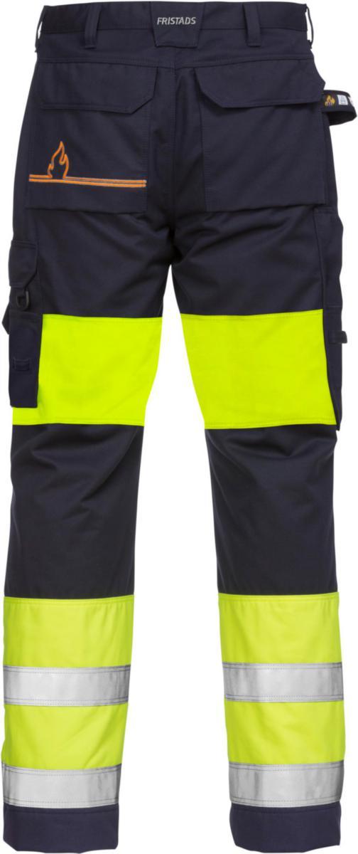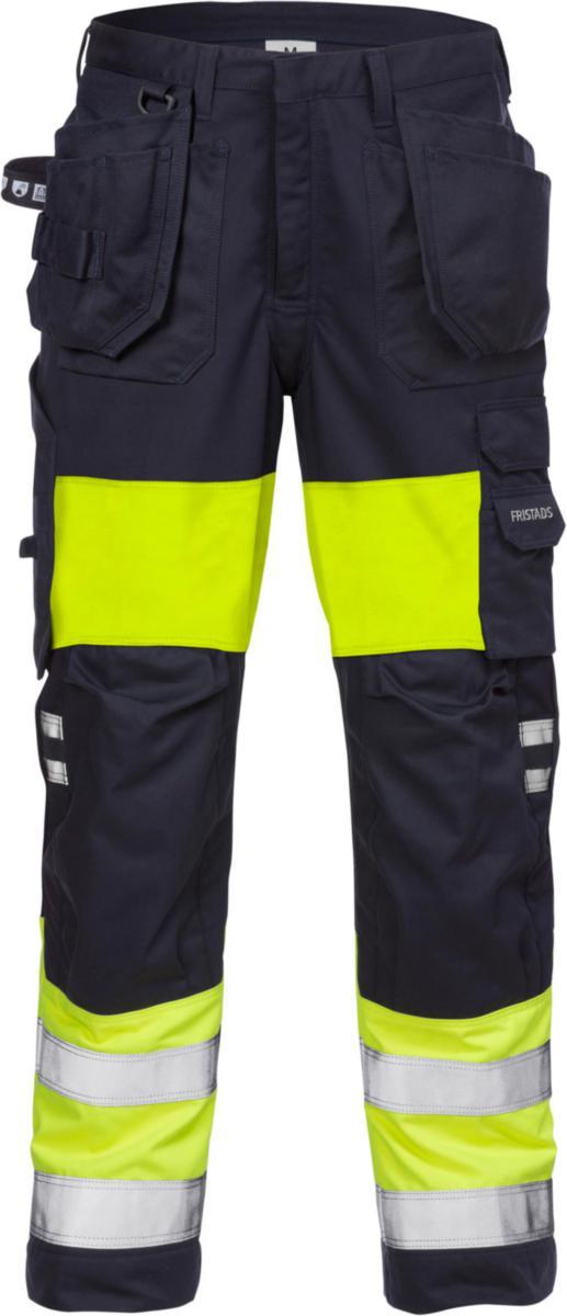 Multinorm / Inherent flamskydd / Metallfri / Smuts-, olje- och vattenavvisande / 2 CORDURA®-förstärkta löst hängande spikfickor, den ena med 3 fickor och verktygshällor och den andra med extra ficka / 2 framfickor / D-ring vid linningen / 2 CORDURA®-förstärkta bakfickor med lock och kardborrelås / Hammarhank / CORDURA®-förstärkt tumstocksficka med verktygsficka samt knapp och hälla för kniv / Benficka med lock och dold tryckknapp, telefonficka med lock, D-ring samt id-kortshållare i plast / CORDURA®-förstärkta knäfickor med öppning inifrån / Reglerbar höjd av knäskydden / CORDURA®-förstärkning i benslut / Den avtagbara ID-kortshållaren innehåller metall / Reflexerna är påsydda med 2-nålssöm / Extra benupplägg, kan förlängas 5 cm. Material: 45% modakryl, 35% bomull, 18% polyamid, 2% antistatisk fiber. Förstärkning: 79% bomull, 20% polyamid, 1% antistatisk fiber. 300 g/m², förstärkning 280 g/m².