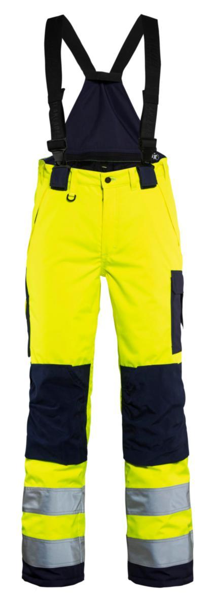 Varmfodrad vinterbyxa i ett slitstarkt vind- och vattentätt material med tejpade sömmar. Byxan har öppningsbart snölås med kardborre samt avtagbara hängslen. För optimal säkerhet och väderskydd är byxan certifierad för både varsel, regn och kyla. CORDURA®-förstärkta på knän, hammarhank i sidan. Hällor, varav en med D-ring, hög linning bak, resår i midja, snölås, öppningsbart med kardborre och knapp. Avtagbar ID-kortsficka, bakficka med bälg och lock med kardborreknäppning, benficka med bälg och lock. Insticksfickor med lock, sidfickor med fleecefoder, tumstocksficka med knivhållare och pennficka. Avtagbara hängslen med resår, benavslut med blixtlås, reflex runt ben. Material: 100% polyester, oxford, laminerad, vattentät 10 000 mm, vindtät, andasfunktion 4000 g/m²/24h, 200 g/m². Foder: Quilt.
