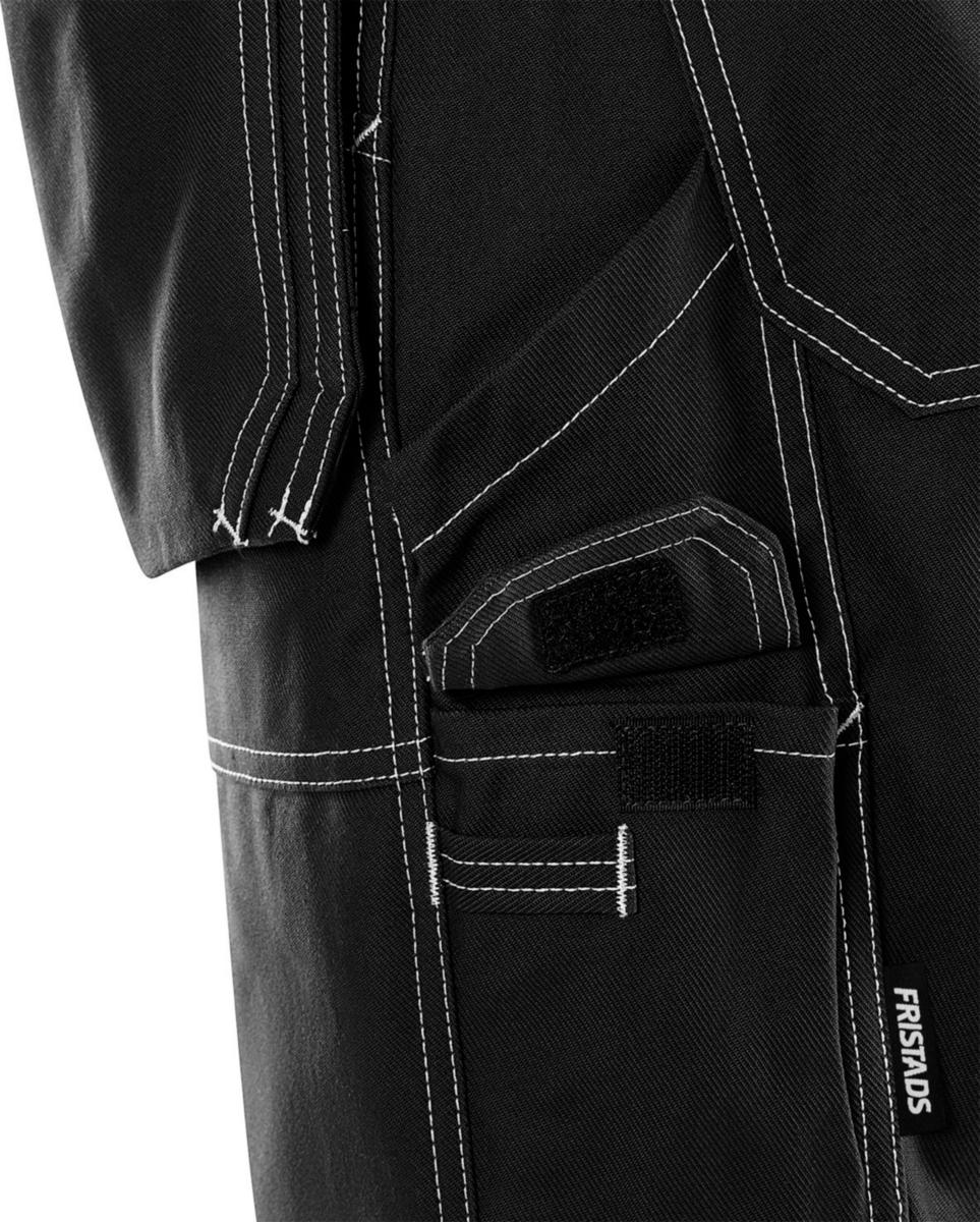 2 löst hängande undanstoppningsbara spikfickor – den ena med extra ficka, den andra med 3 mindre fickor och verktygshällor, 2 fram- och bakfickor, tumstocksficka, telefonficka, pennficka , verktygsficka, hammarhank, knivknapp och -hälla, D-ring. Material: 100% bomull, 375 g/m². PFAS-fri