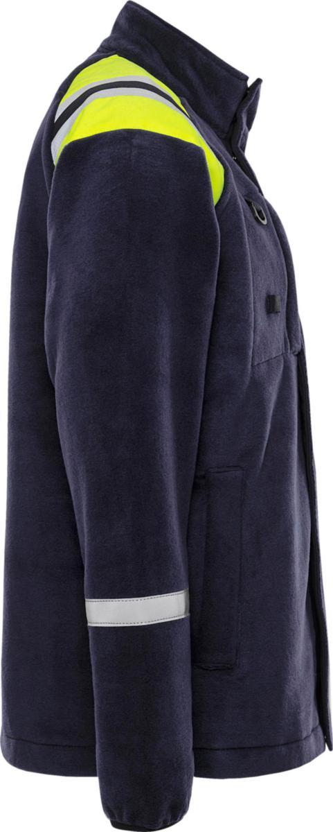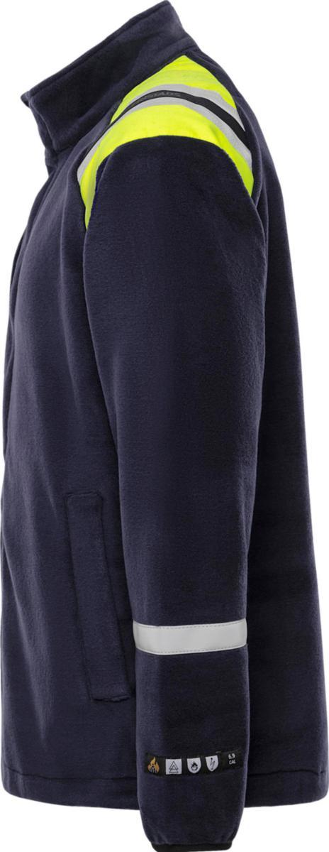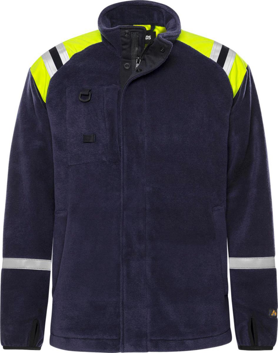 Inherent flamskydd, dragkedja upp i kragen, under frontslå med dolda tryckknappar, bröstficka med dold dragkedja och D-ring. 2 framfickor, elastisk bandkant i ärmslut med tumgrepp, dragsko i nederkant, reflexdetaljer på axlar och reflex runt ärm. Testad för industritvätt enligt ISO 15797. OEKO-TEX®-certifierad. Material: Fleece av 60% modakryl, 30% bomull, 18% polyester, 2% antistatisk fiber med inherent flamskydd, 370 g/m². Tvättråd: Kan maskintvättas i maxtemperatur 60 °C, normalprogram.