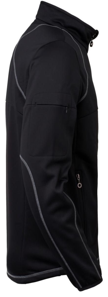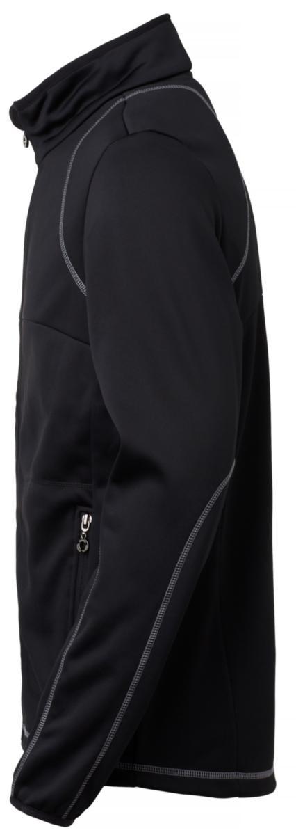 Powerstretchjacka med elastiska bandkanter i kontrastfärg vid hals och ärmslut. Fickor med dragkedjor och detaljerade kläppar. Samtliga dragkedjor och pullers i kontrastfärg. Flatlocksömmar och mjuka avskärningar. Högerärm med mobilficka och öppning för sladd på insidan. Material: 2 lager, single jersey bondat med fleece, 100% polyester, 240 g/m². Tvättråd: 40°.