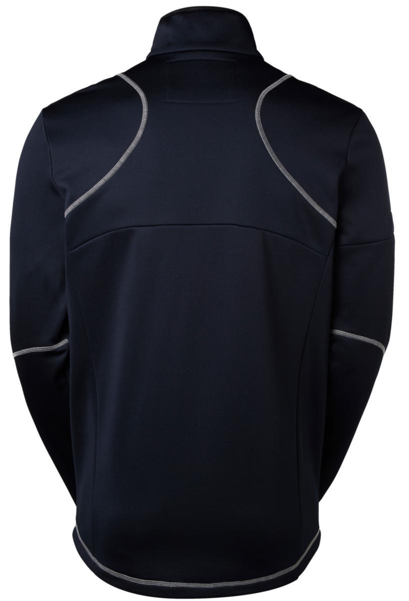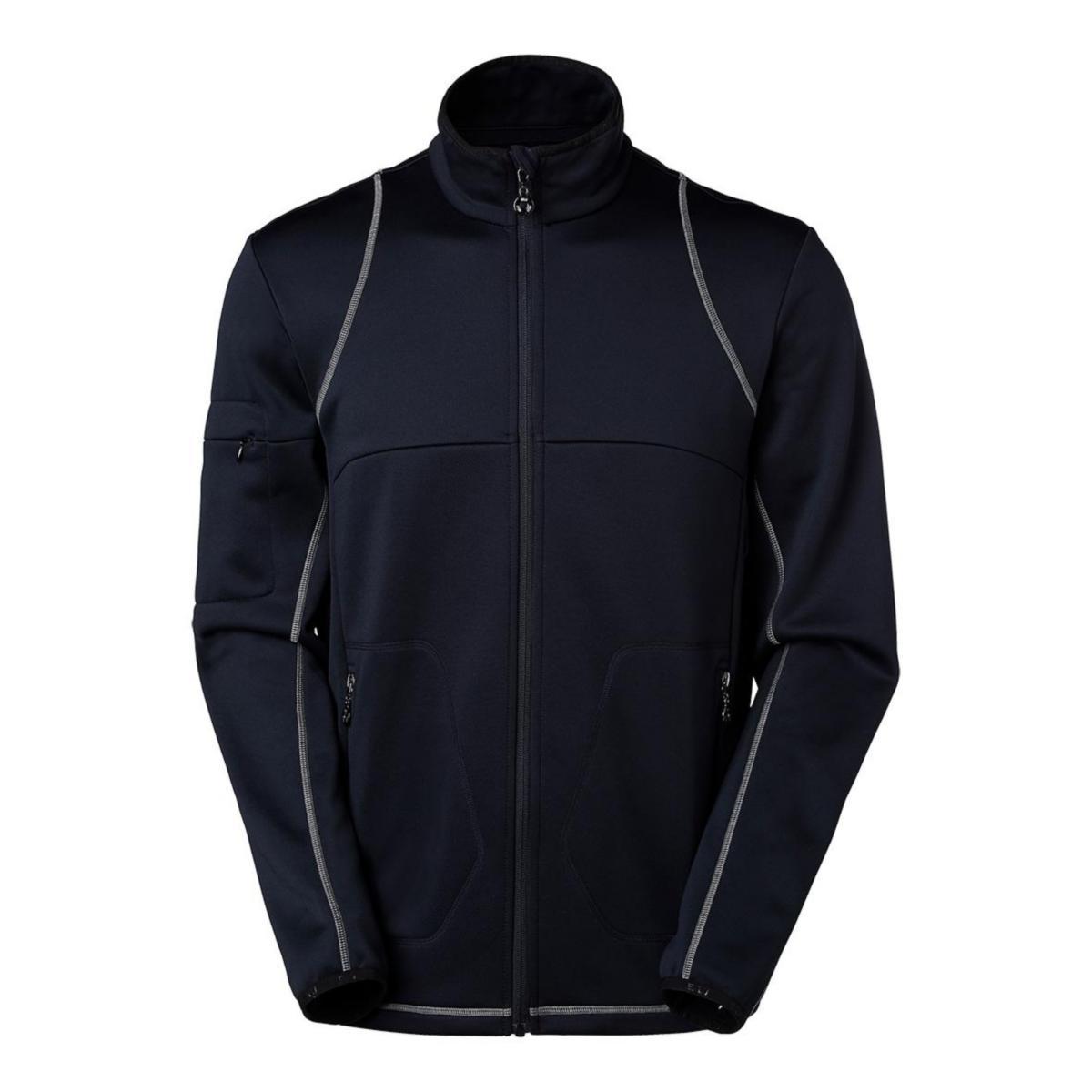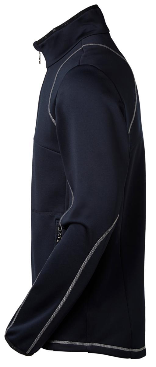 Powerstretchjacka med elastiska bandkanter i kontrastfärg vid hals och ärmslut. Fickor med dragkedjor och detaljerade kläppar. Samtliga dragkedjor och pullers i kontrastfärg. Flatlocksömmar och mjuka avskärningar. Högerärm med mobilficka och öppning för sladd på insidan. Material: 2 lager, single jersey bondat med fleece, 100% polyester, 240 g/m². Tvättråd: 40°.