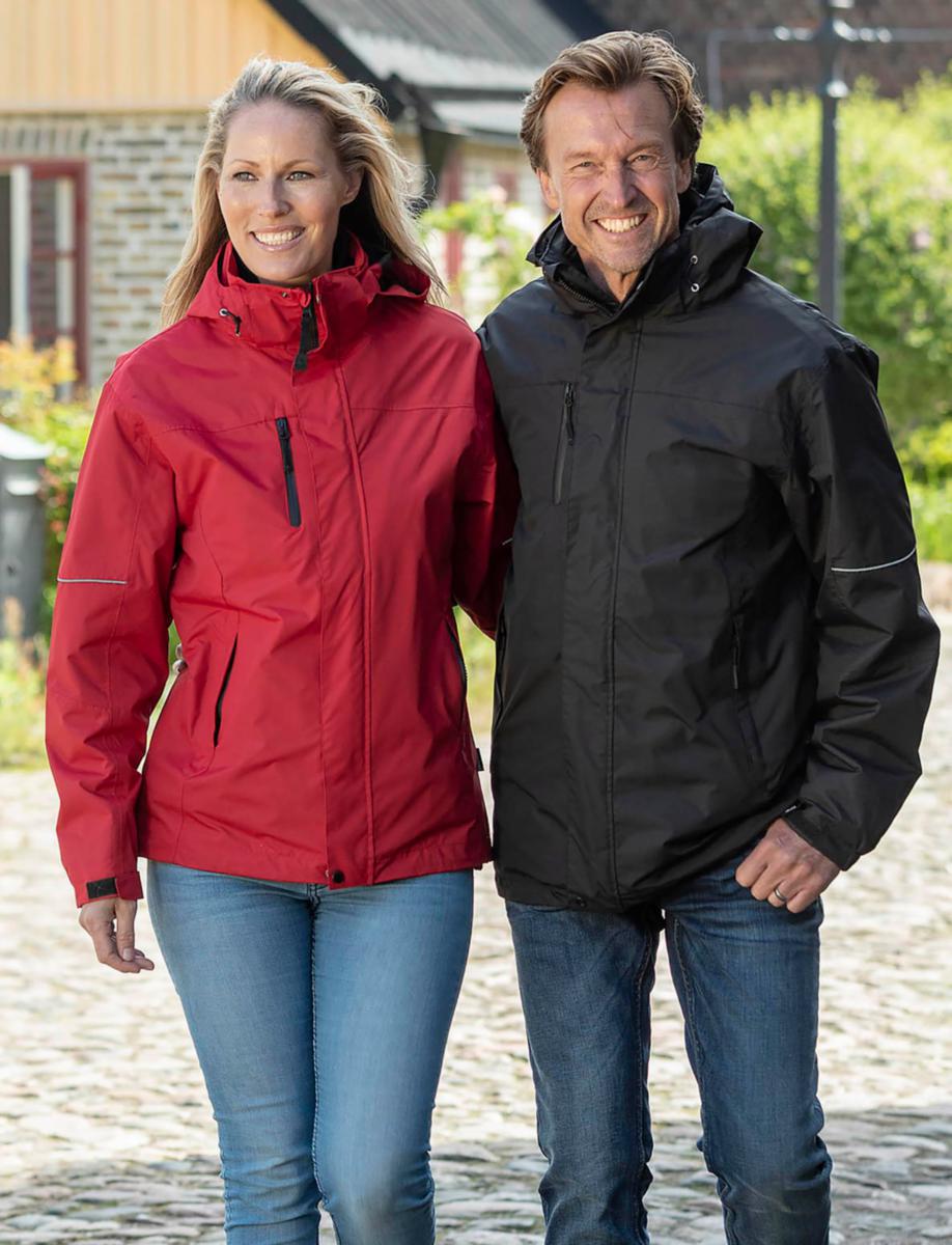 Yttertyg 100% polyester A.B:T • Innertyg 100% polyester • Foder Fleece 100% Polyester. Vindtät, vattentät samt andasfunktion. Vattentäthet 12.000mm / Andningsbarhet 6.000g/m2/24h. Tejpade sömmar. PFC fri ytbehandling av yttertyg “Bionic ECO". Tvättråd: 40°.