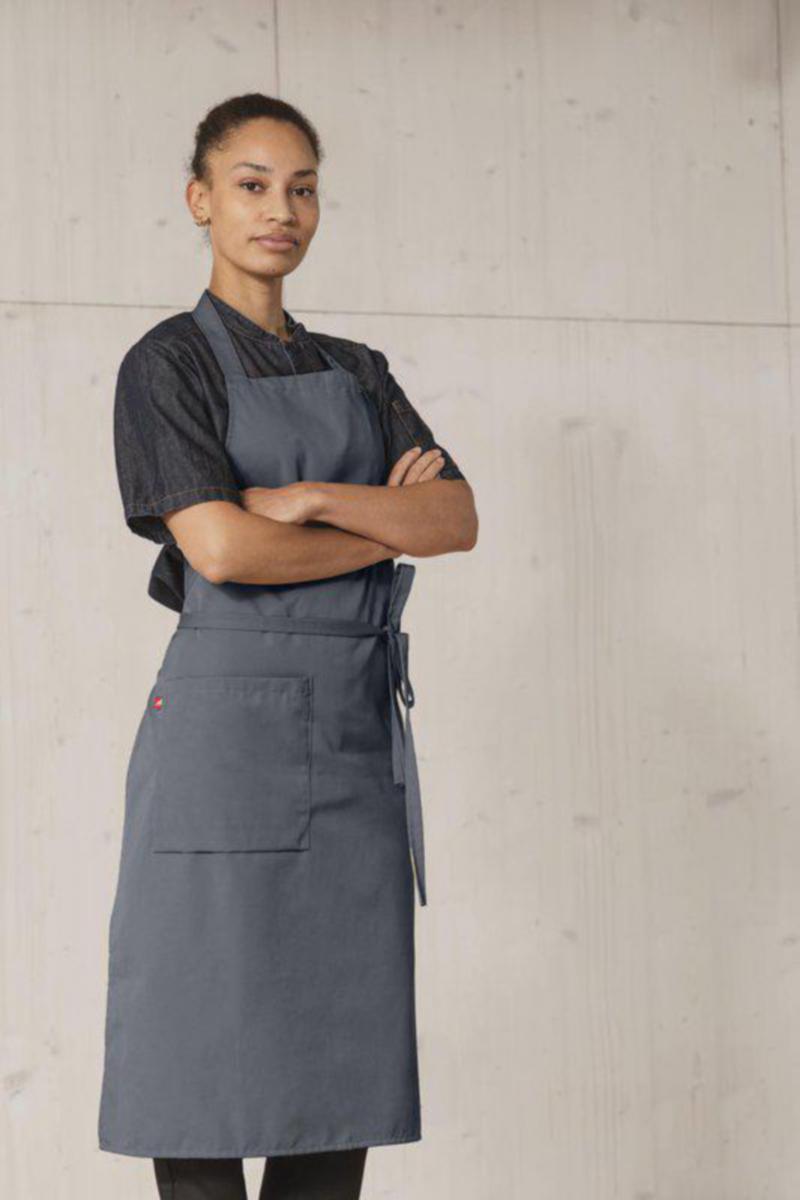 Bröstlappsförkläde i klassisk modell med nackband och rymlig ficka på höger sida. 70 X 100 cm Miljöbättre tyg Reglerbart nackband med tryckknappar Nyckelhälla och hank för upphängning 65/35 % återvunnen polyester/bomull - Twill - 210g/m²