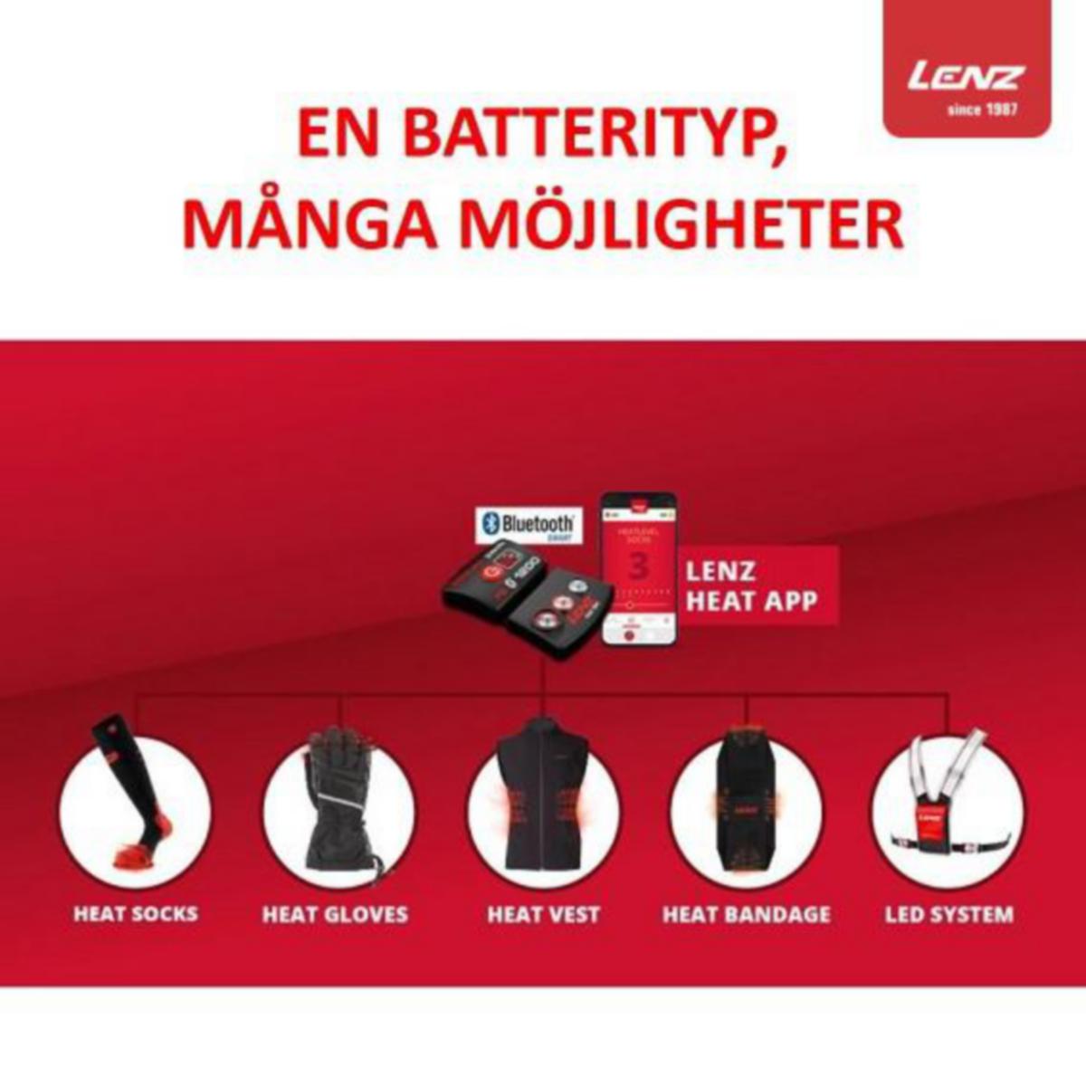 Uppladdningsbara litiumbatteripackar för Lenz värmestrumpor, -handskar, -västar och -byxor, reglerbara via bluetooth och mobilapp. Går även att justera direkt på batteripacket. Passar samtliga värmestrumpor, värmehandskar, värmevästar och värmebyxor från Lenz och fästes med tryckknappar på plagget. Värme i tre nivåer, justerbart via knapp på batteripacket, eller steglöst via mobilappen. Håller värmen i upp till 14 timmar, enligt bifogad tabell. USB-laddkabel medföljer.