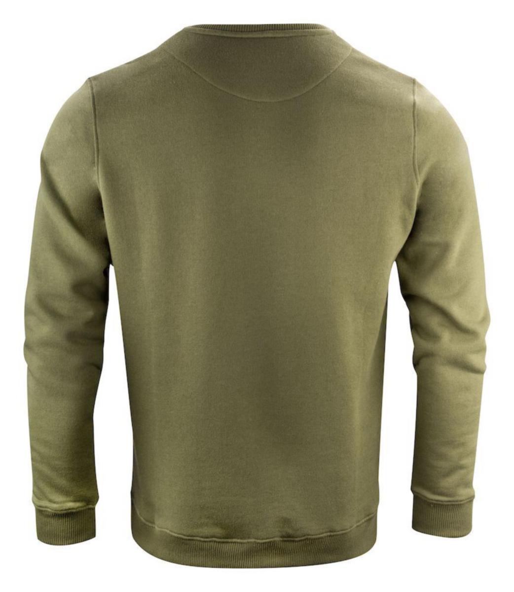 Rundhalsad sweatshirt med halvmåne i nacken. Borstad på insidan. Ribbstickade muddar. Oeko-Tex, certifierad ekologisk bomull och certifierad återvunnen polyester. Material: 80% organisk bomull, 20% återvunnen PES, 300 g/m². Tvättråd: Normal maskintvätt vid 40 grader.