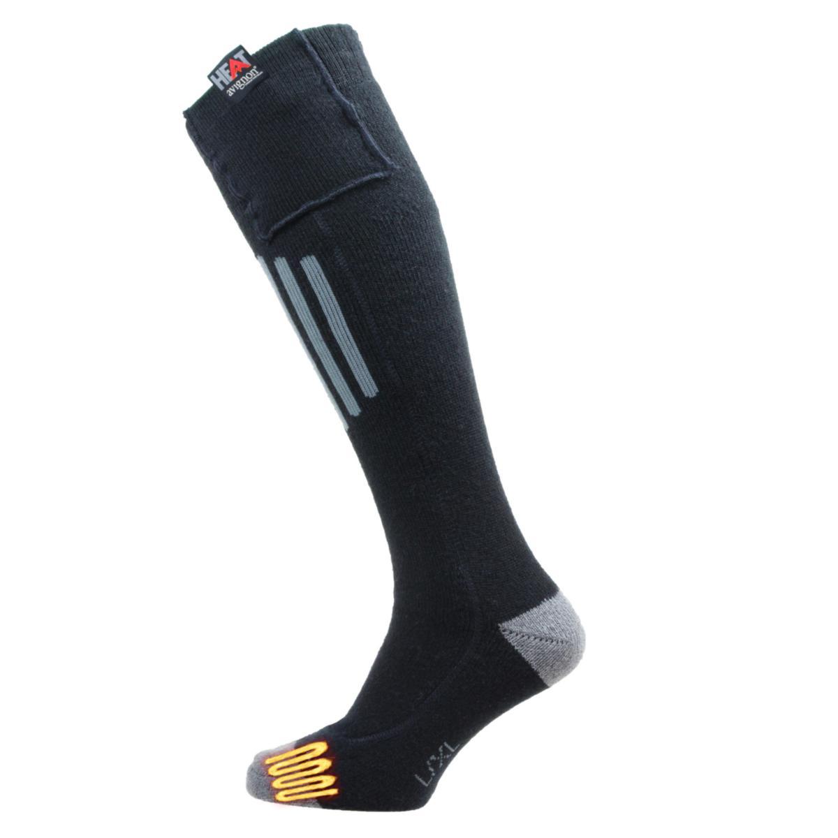 Värmande ullstrumpa. Värmepaneler placerade på ovansidan av tårna. Batterificka högst upp på utsidan av strumpan. Drivs av 2x3 st AA-batterier (köps separat) och har en enkel PÅ/AV-knapp. Värmenivå på 60 grader och upp till 6 timmars värmetid.
