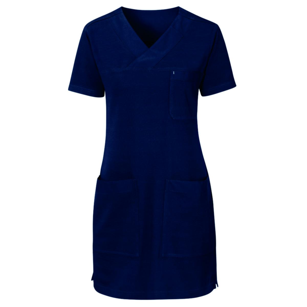 Lätt figursydd modell med V-ringad hals. Gjord i pikéjersey med detaljer i vävtmaterial. Kort ärm. Förstärkta sidfickor med dold telefonficka och nyckelhälla i den högra. Bröstficka med nedstickning för penna. Extra pennficka i halsslån. Hank i nacke. Längd mitt bak storlek M: 87 cm. Oeko-Tex®. Material 50% Bomull 50% Polyester. 230 g/m².