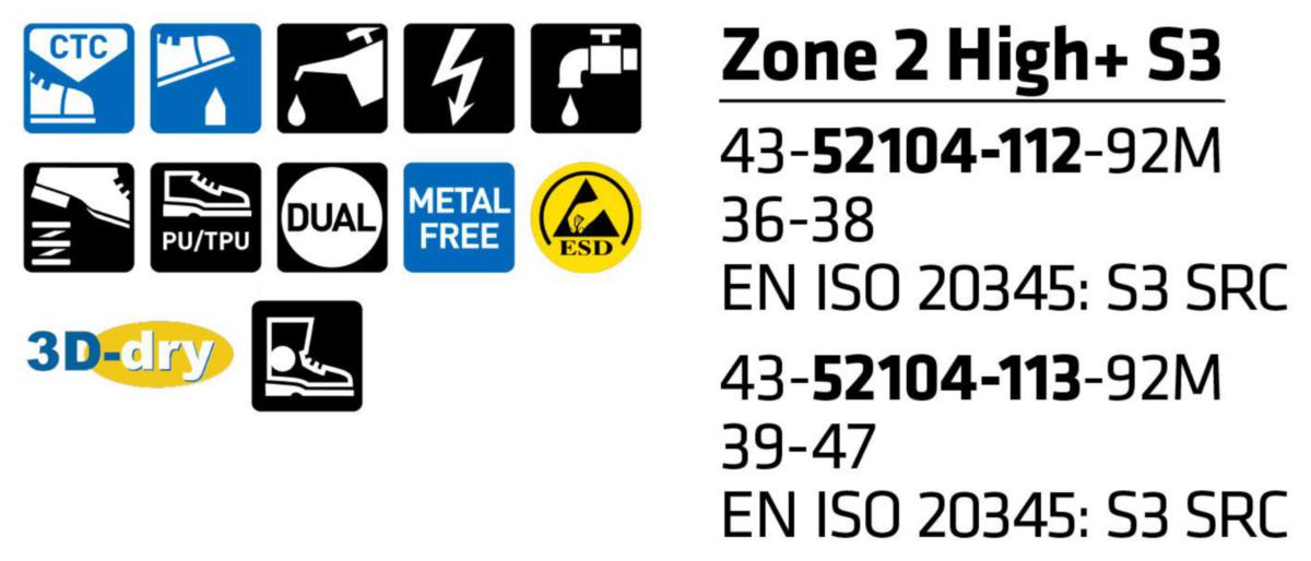 Skyddskänga med Memory-Foam vriststöd. Metallfri. Standard: EN ISO 20345: S3 SRC.