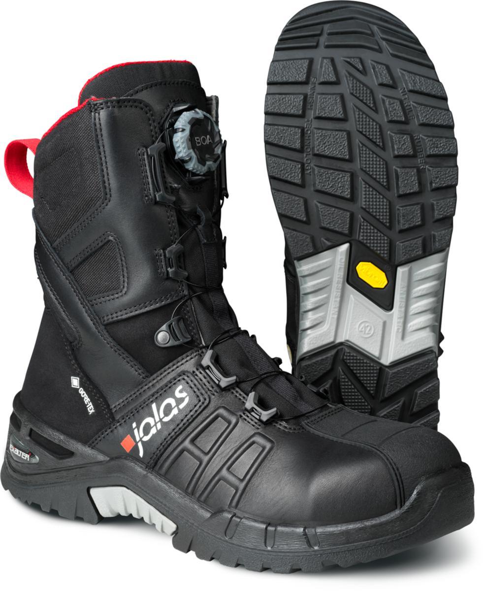 JALAS® 9998 EXALTER GTX, Skyddssko, spiktrampskyddsmaterial plasmabehandlad textil, tåhättematerial aluminium, plastgelänk, slitsula i nitril, ovandelsmaterial: narvläder;Microfiber;Textil. Värmebeständig yttersula, oljebeständig yttersula, antistatiska egenskaper, bälgplös, polstrat skaft, ventilerande innersula, BOA® Fit System, snabbsnörning, stabilizator, vattentät, ergonomiskt utformad, mjuk, specialdesignade detaljer, dubbla stötdämpningszoner, överensstämmer med IEC 61340-5-1 (ESD). Standard: EN ISO 20345:2011, S3, SRC, WR, HRO.