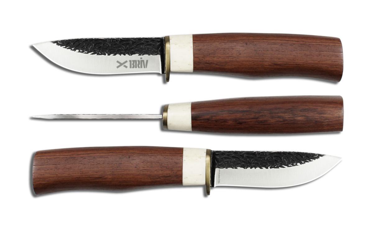 Jaktkniv med rostfritt knivblad av 420-stål och med handtag i rosenträ och ben. Försedd med ordentlig parerstång i mässing för säkert grepp.