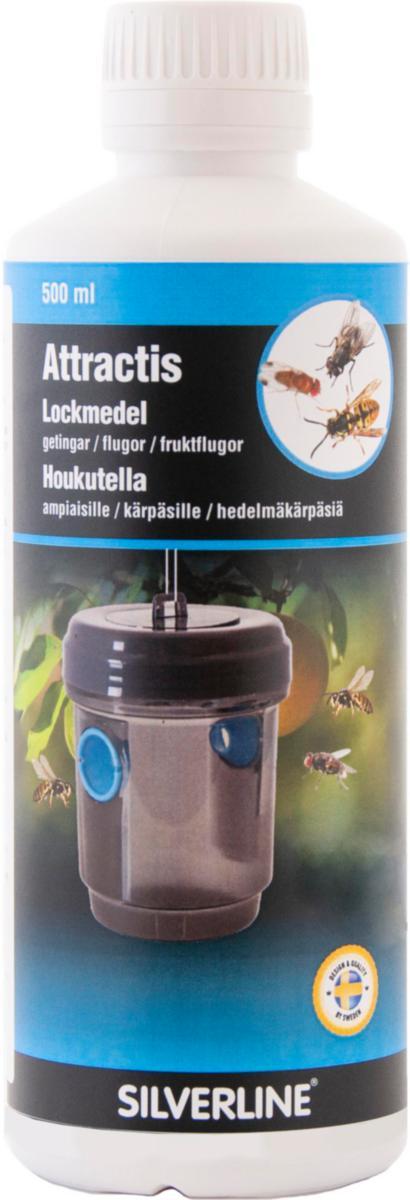 Attractis är ett lockmedel för getingar, fruktflugor och husflugor. Används med fördel i Silverlines Flug & Getingfälla Outdoor FW1 eller liknande fälla. Vid användning för getingar och flugor: blanda 1 del produkt med 3 delar vatten. För att locka fruktflugor ska produkten användas outspädd. Mängden lockmedel som placeras i fällan skall vara tillräcklig för att dränka insekterna. Anpassa volymen till fällans storlek. Fällan placeras eller hängs på plats där getingarna eller flugorna samlas. Kontrollera fällorna och byt ut produkten minst en gång i veckan. Byt även ut produkten när fällan är full med insekter eller när hälften av vätskan har avdunstat.