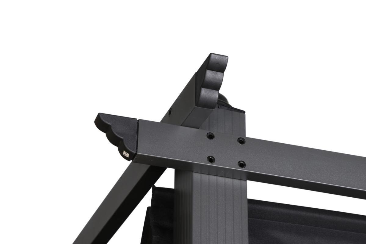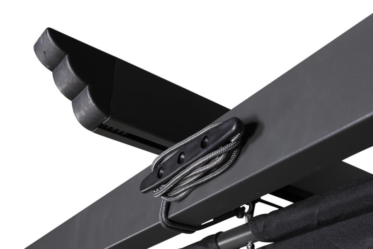 Lazio, en stilren pergola med en stomme i aluminium och en utdragbar takdel i polyester. Plocka ned pergolan när den inte används och förvara den torrt och skyddat.