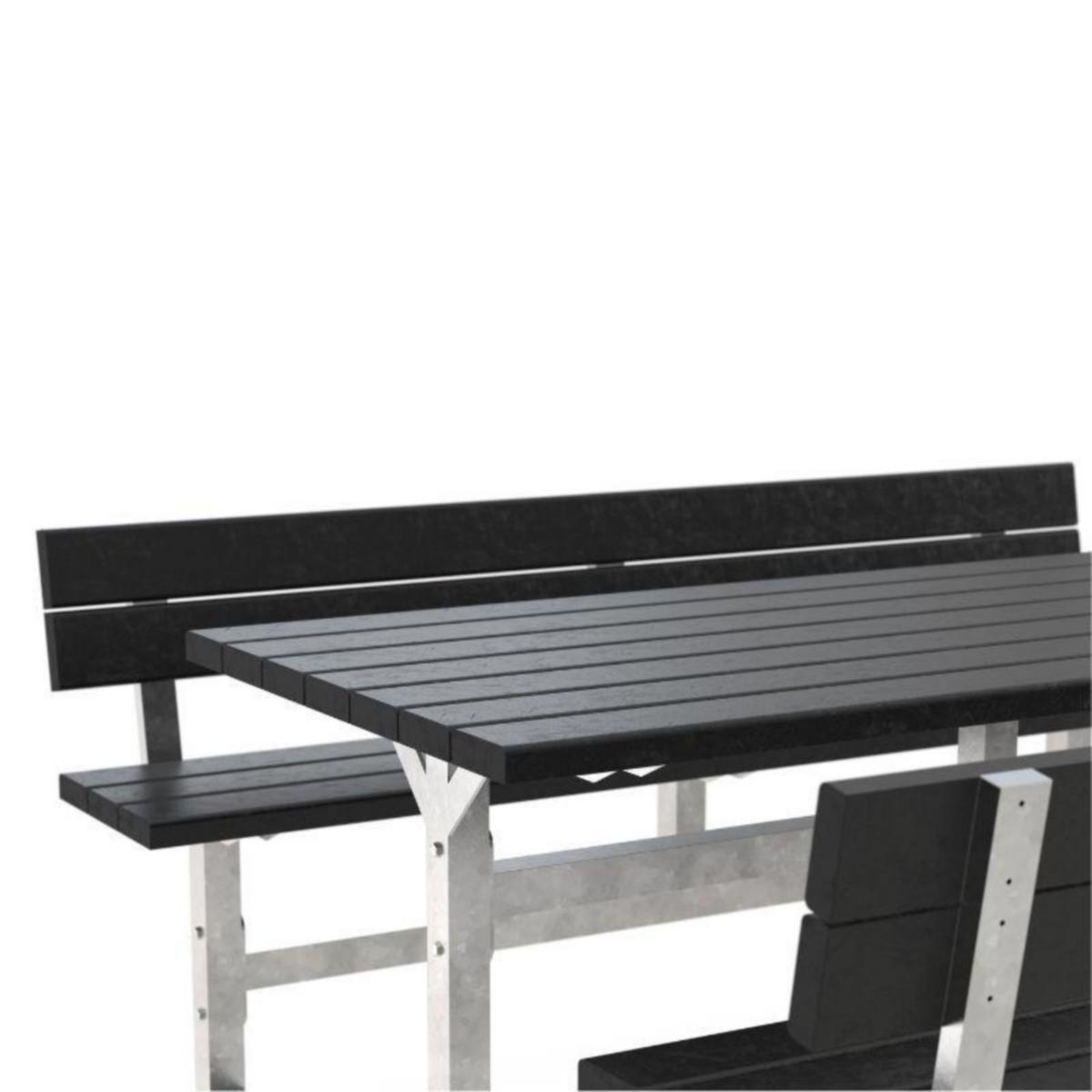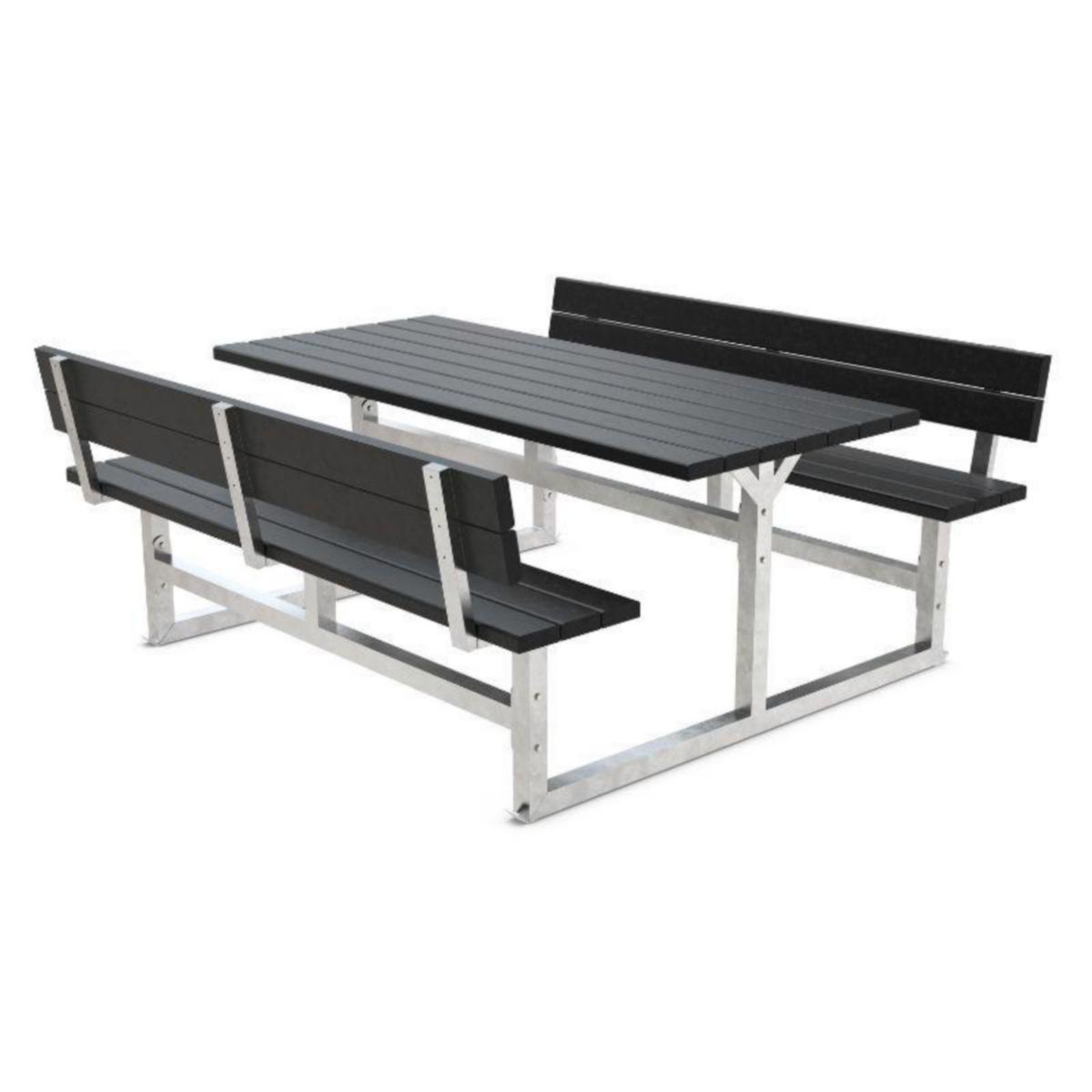 Picknickbord med 6 sittplatser och ryggstöd. Tillverkat av återvunnen plast. Den solida galvaniserade stålramen ger en robust och stabil bas som säkerställer att den klarar av utomhusbruk.