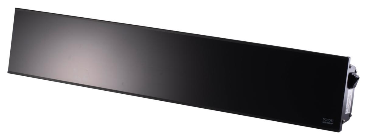 Relax Glass, en elegant infravärmare med front i tonat keramiskt glas. Denna kortvågiga infravärmare levererar omedelbar värme. Den diskreta och stilrena designen gör den idealisk för utomhusmiljöer, såsom privata uteplatser, takterrasser och uteserveringar.