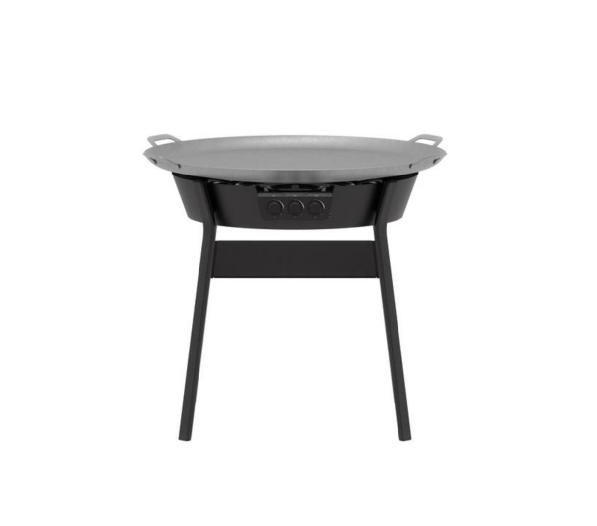 Elegant stekhällsset som passar för matlagning till fler än 14 personer. Inkluderar en emaljerad gasolbrännare och ett stadigt stativ i metall med långa ben i D-profil. Setet innehåller även en stekhäll i varmvalsat stål med en diameter på 100 cm. Gasolbrännaren har vred med integrerad tändning och tydlig markering som gör det enkelt att veta hur m ycket värme som fördelas över hällen. Värmen regleras individuellt på de tre gasolringarna, vilket ger möjlighet att skapa olika temperaturzoner på hällen. Setet har också ett fast vindskydd som effektivt skyddar lågorna. CE-märkt. Stekhällen bör förvaras torrt när den inte används.