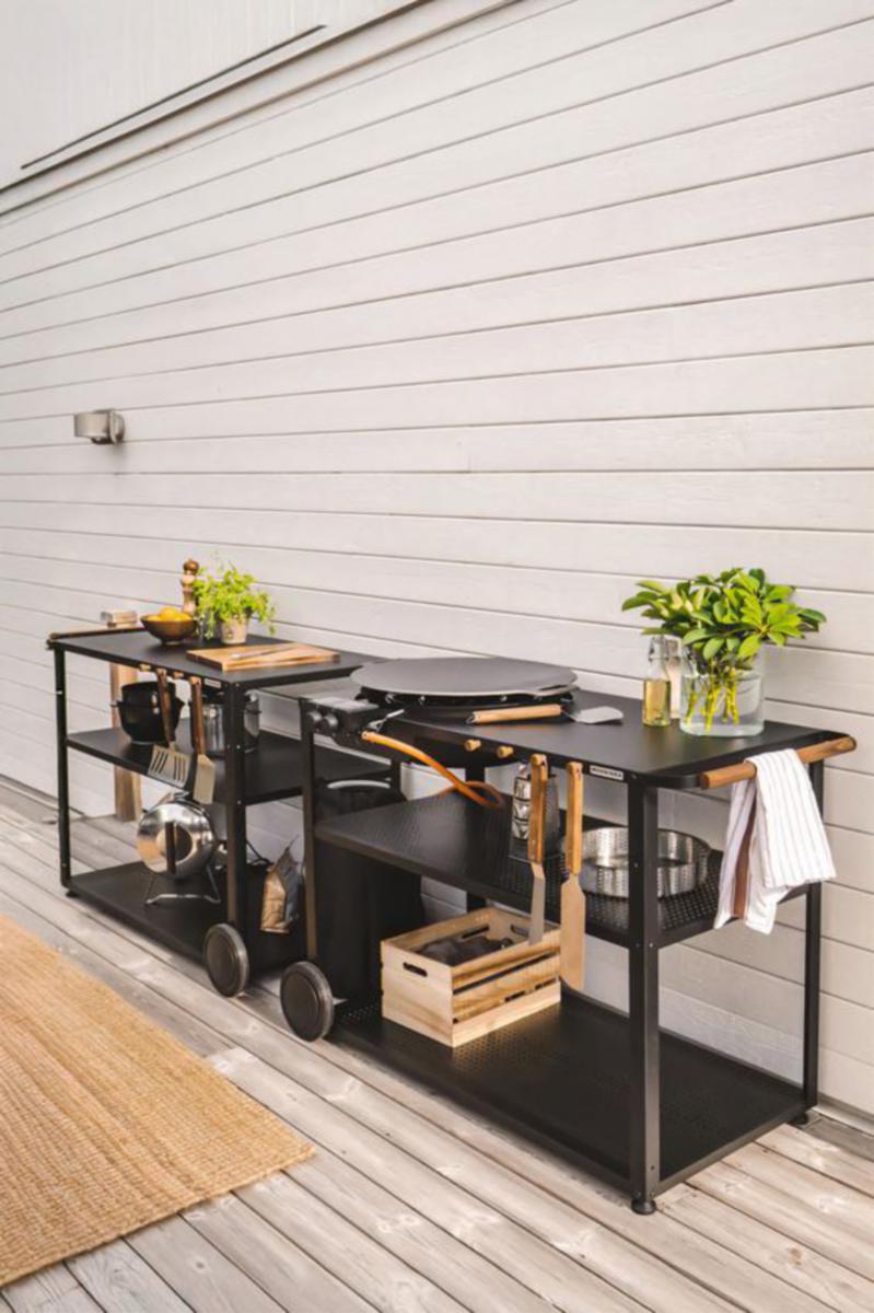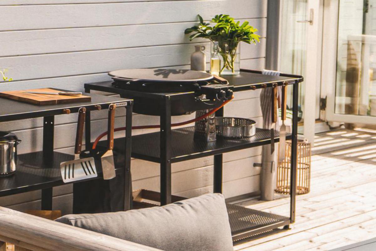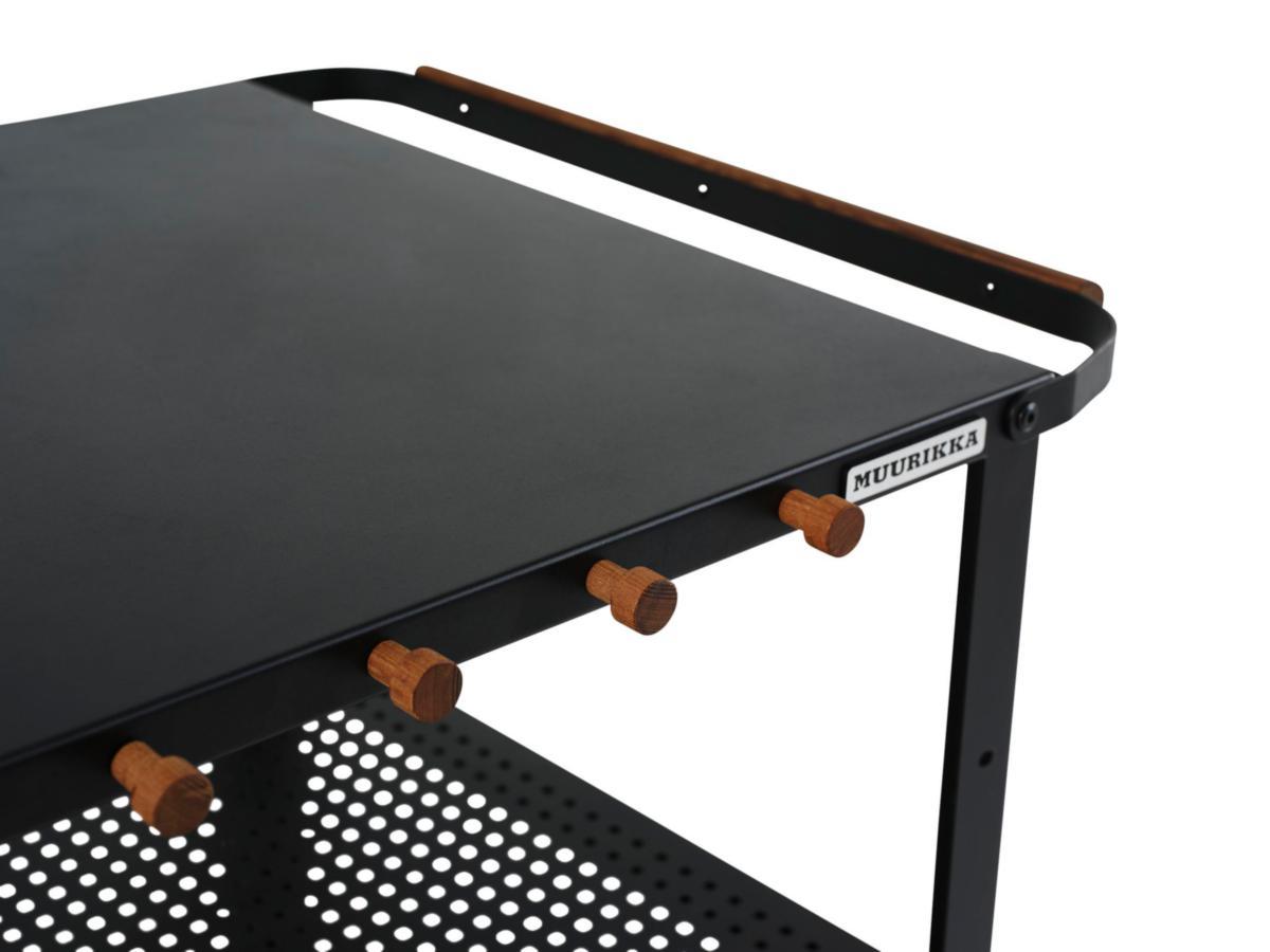 Stekhällssetet har smarta förvaringslösningar med hyllor i två nivåer och fyra krokar i FSC-certifierad rökt ask, så att redskapen alltid finns nära till hands. Draghandtaget i samma material gör vagnen lätt att flytta och kan även användas för att hänga handduk eller grilltång.