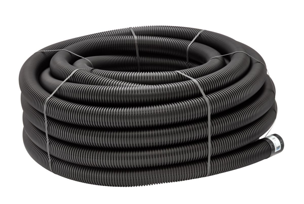 Enkelväggig korrugerad dränering på rulle. Inklusive en skarvmuff.
