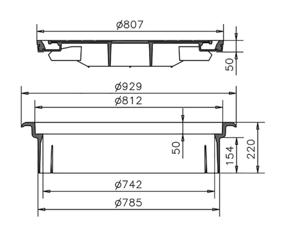 Flytande betäckning komplett med lock för nedstigningsbrunn med dagöppning 800, täta spetthål, självlåsande, pågjuten packning.