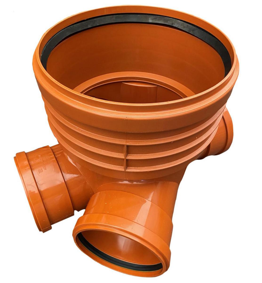 Tillsynsbrunn i PP med rakt genomlopp och anslutning vänster för släta markrör. Toppanslutning för 400mm stigarrör.
