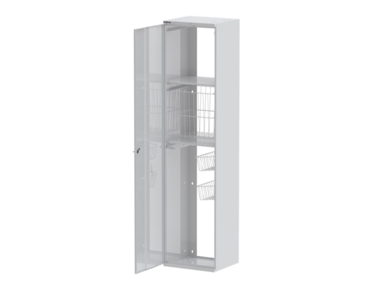 I modellen Combi har tvättskåpets och städskåpets bästa egenskaper kombinerats till en fungerande helhet. Produkt är tillgänglig med en korg eller två korgar. Skåpet är tillverkat i pulvermålat stål med nanokeramisk ytbehandling. 2 hyllor, en tvättkorg och 2 redskapskorgar. Handduksstång och hängkrok. Cylinderlås. Bottnen på skåpet har färdiga hål för möbelben. Vänsterhänt.