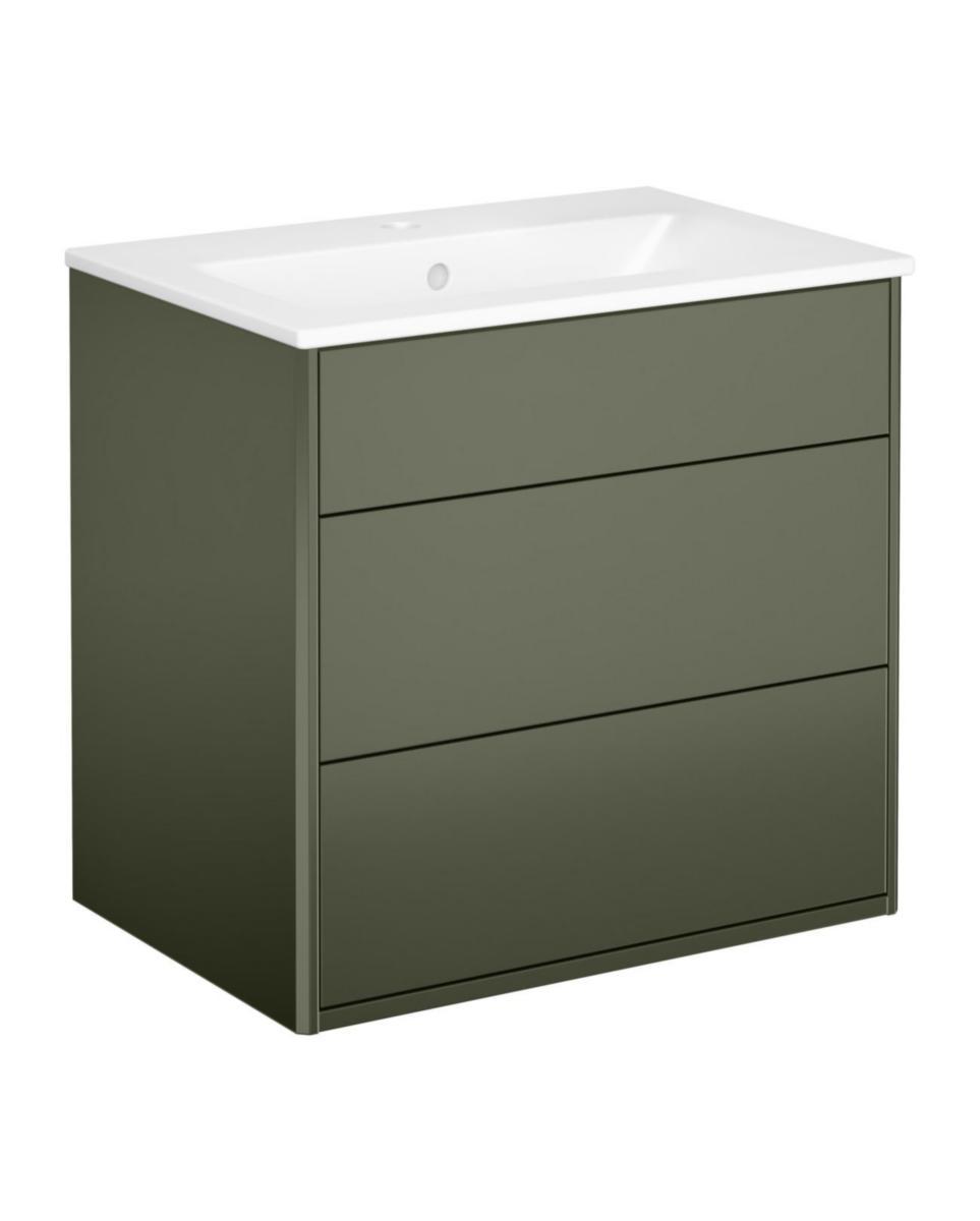 Graphic Kommod grön med tvättställ 60 cm. Lönnfack för förvaring av småsaker och utrymme för montage av eluttag. Det utfällbara lönnfacket ger extra avställningsyta vid behov och innehåller en prylmagnet. Mjukstängande lådor för tyst och mjuk stängning, Lådor med fullutdrag för en komplett översikt över alla dina saker. Plats för rördragning bakom lådorna. Platsbesparande kommodvattenlås med pop-up funktion ingår.