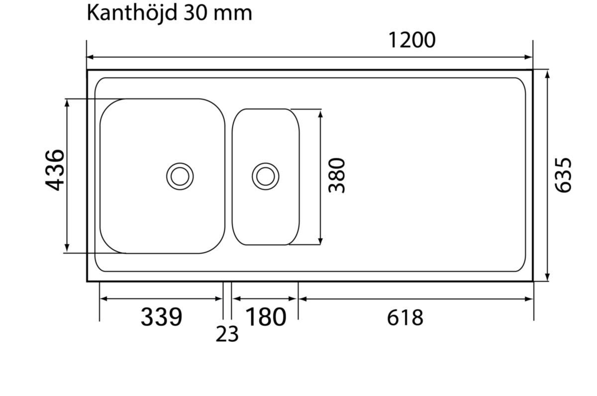 Vändbar heltäckande diskbänk, med stor och liten låda. Levereras med korgventiler, bräddavlopp och vattenlås. Stor låda: 339x436x160 mm Liten låda: 180x380x160 mm Yttermått: 1400x610x30 mm.