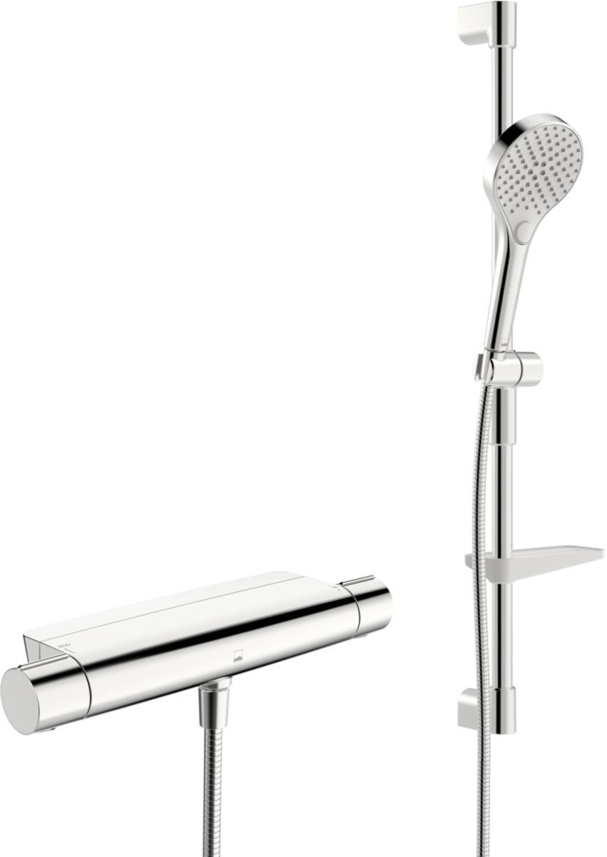 Duschpaket innehållande termostatblandare för dusch, anslutning 160cc med M26 x 1.5 utv.g., samt duschset. Blandaren har användarvänliga vred med temperaturbegränsnings knapp 38°, kontroll för Ecoflöde via tryckknapp. Blandaren är utrustad med backventiler och smutsfilter. Duschset med Ecoflöde, duschslang 1750mm, duschstång, hållare för handdusch, flexibla/fasta väggfästen och handdusch med 3-strållägen för en komfortabel duschupplevelse. Handduschen är enkel att rengöra tack vare sina antikalk-munstycken.
