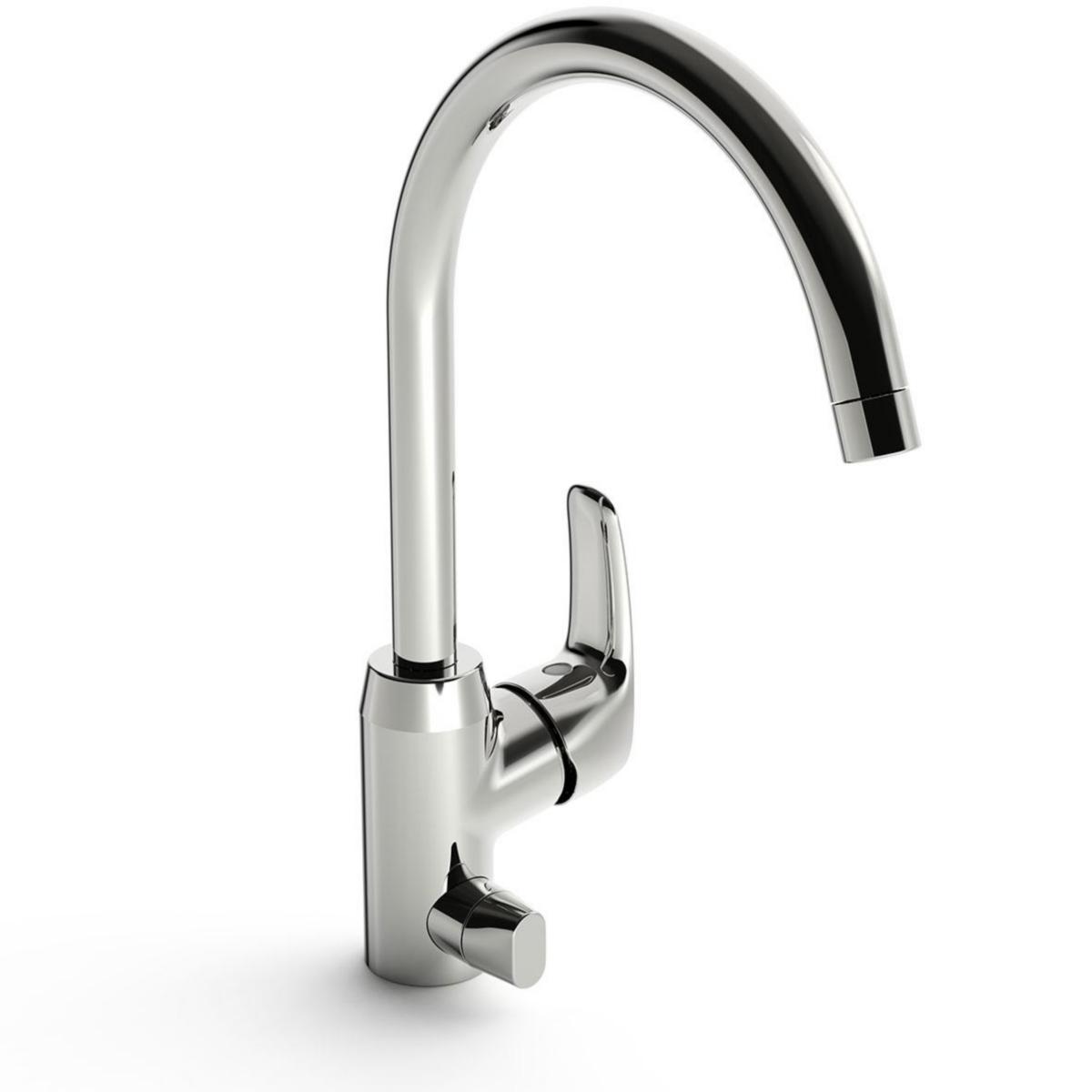 Köksblandare med keramisk diskmaskinsavstängning och hög svängbar pip. Utloppspipens svängradie är förinställd på 120° (kan begränsas till 0°/60°/360°). Inbyggd spärr för begränsning av temperatur och flöde. F = flexibel anslutning.