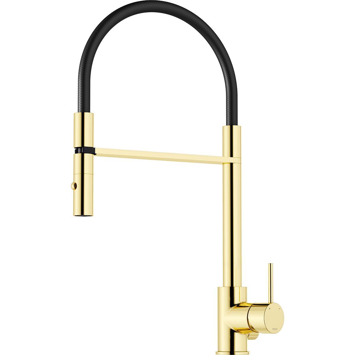 Mjukstängande köksblandare med svängbar pip med 2-stråligt munstycke.