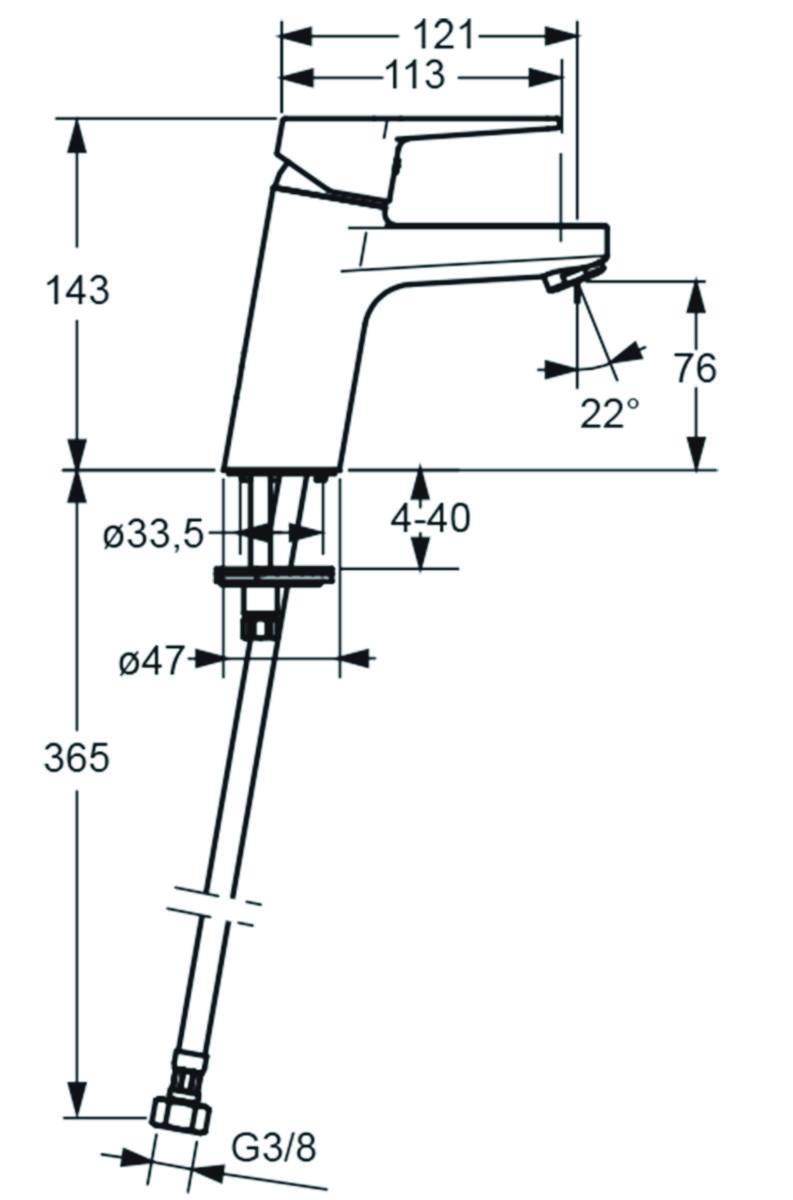 Tvättställsblandare med fast utloppspip och strålsamlare. Inbyggd spärr för begränsning av temperatur och flöde, kallstartskassett, flödeskontroll l/min. Energiklass A