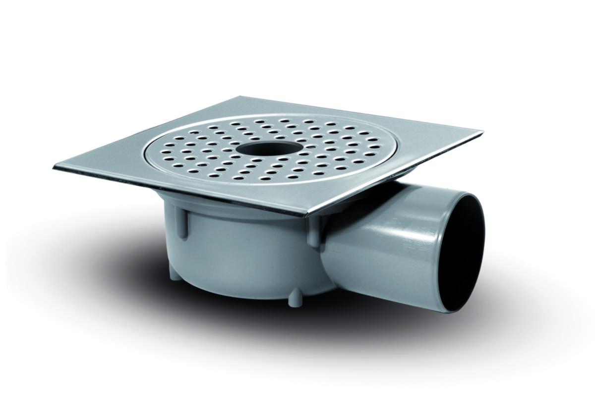 Golvbrunn i grå, svetsbar PEH-plast med 50 mm stängande pungvattenlås.