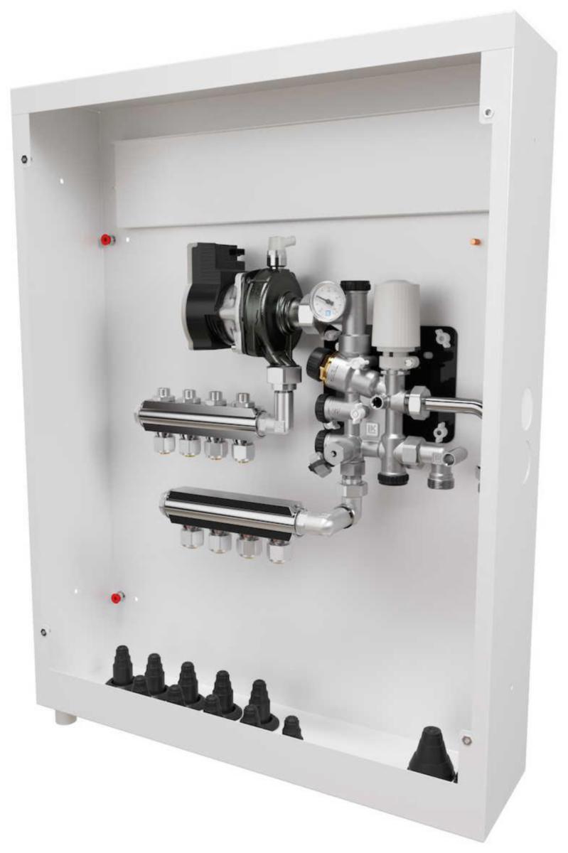 Skåpet levereras med rörgenomföringar, bälgmuff för dränage, dränageböj med utloppsbricka, kabelgenomföringar för rumsreglering, sprutskydd samt monteringsanvisning.