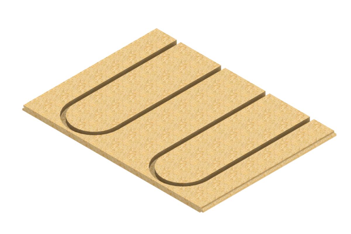 Spårad golvspånskiva med cirkelformade spår anpassade för c/c 200 mm. Används på regelverk c/c 600 vid renovering eller nyproduktion och bildar bärande golvkonstruktion.
