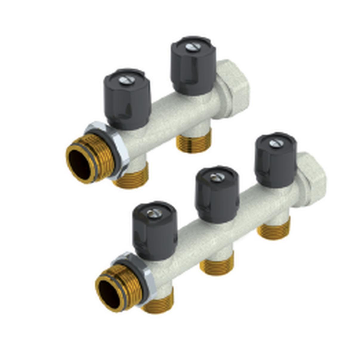 Fördelare för tappvatten och värme med avstängningsventiler. Anpassad för snabbtätning.