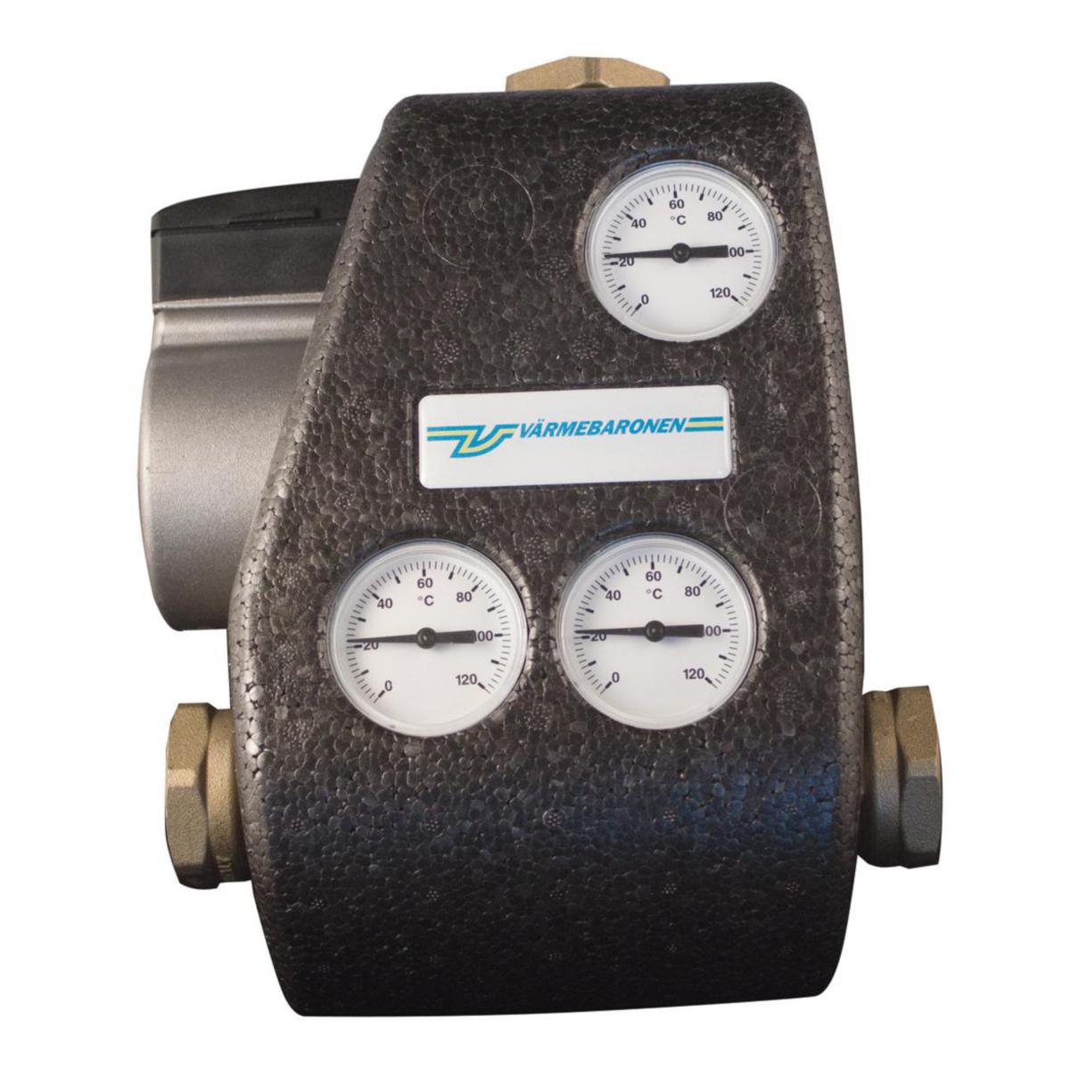 Ackstyrning 3 är ett laddningspaket mellan vedpanna och acktank. styr flödet med en termisk ventil och drivs med en cirkulationspump. Ackstyrning 3 har en inbyggd backventil som öppnar automatiskt för