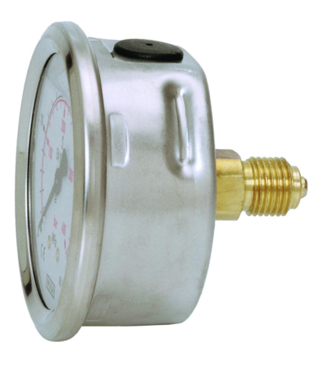 Tryckmätare i vätskedämpat utförande för flytande eller gasformiga, icke aggressiva mätmedier samt vid hårda driftsföhållande där vibrationer och tryckstötar förekommer. Medieberörda delar av kopparlegering. Mätnoggrannhet kl. 1,6%. Hus av rostfritt stål. Även med frontfläns eller bygel.