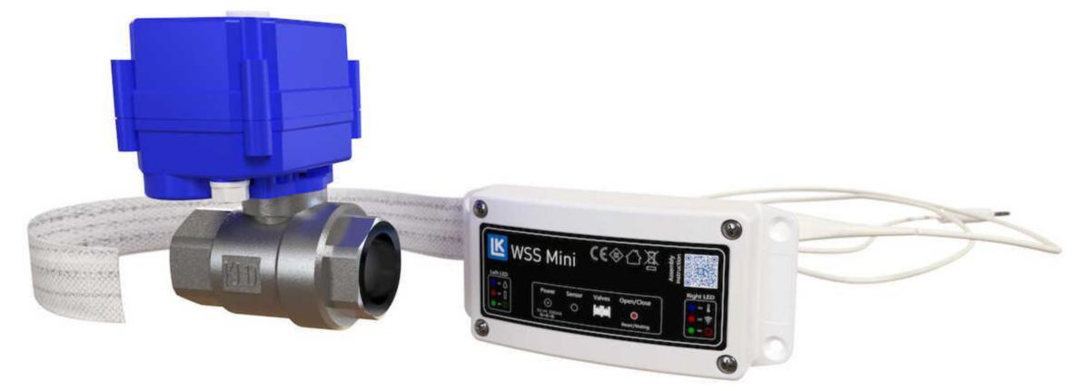 LK WSS Mini Start är ett paket med en huvudenhet, en motorventil G20 och en sensor. Paketet kan användas där man önskar stänga av vattnet då en vattenläcka detekteras, t ex vid en vattenautomat eller en kaffemaskin. Systemet spänningsmatas med en 5V nätadapter. Det går att ansluta flera sensorer för detektering på en större yta.
